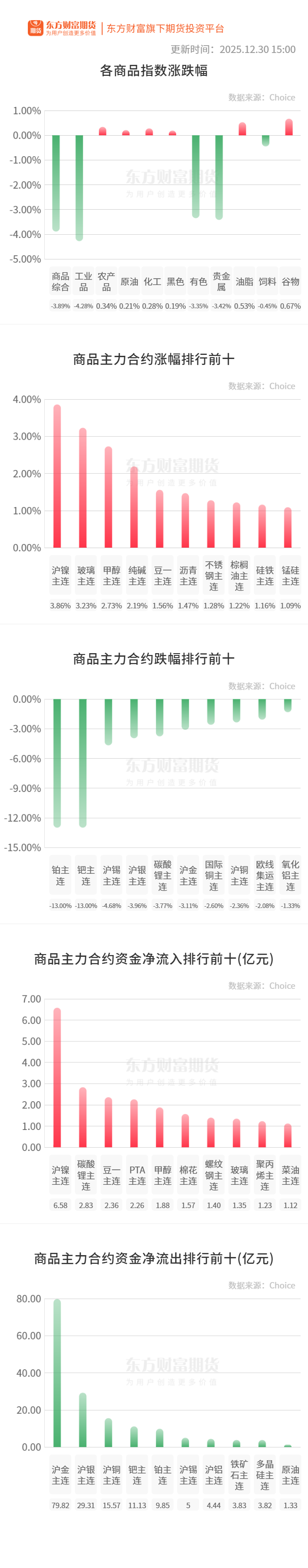 行情纵览![]() 宏观产经央视新闻:今天,也门总统领导委员会当地时间发布共和国令,宣布全国进入紧急状态,为期90天。声明称,总统领导委员会主席表示,将坚定致力于保护平民安全,并纠正在“支持合法性联盟”框架下的合作方向。委员会要求“国家盾牌部队”立即行动,接管位于哈德拉毛省和马哈拉省的军事营地。声明还宣布,也门总统领导委员会要求驻也门的阿联酋部队在24小时内撤离也门领土,并决定取消与阿联酋签署的共同防务协议。 新华社:美国总统特朗普29日下午在佛罗里达州海湖庄园会晤到访的以色列总理内塔尼亚胡。他威胁称,如果伊朗试图重建弹道导弹项目,美方将支持以色列对伊朗再次发起打击。伊朗最高领袖哈梅内伊的政治顾问阿里·沙姆哈尼随即在社交媒体表示,任何侵略行径都将遭遇伊朗猛烈回击。 品种资讯黑色系期货 焦煤:按照焦煤长协煤钢联动方案数据测算,2025年12月焦煤长协煤钢联动浮动值比2025年11月下跌55元/吨,跌幅3.6%。(中钢协) 铁矿石:卫星数据显示,2025年12月22日-12月28日期间,澳大利亚、巴西七个主要港口铁矿石库存总量1102.2万吨,环比下降122.5万吨,呈回落态势。目前库存量已降至今年第四季度以来的最低水平。(我的钢铁网) Mysteel统计中国47港进口铁矿石库存总量16682.36万吨,较上周一增加246.21万吨。(我的钢铁网) 农产品期货 生猪:据农业农村部监测,截至12月30日14:00时,全国农产品批发市场猪肉平均价格为17.73元/公斤,较前一日上升0.3%;鸡蛋平均价格为7.41元/公斤,较前一日上升0.8%。(新华财经) 油脂:据监测,截至12月26日国内三大油脂商业库存小幅下降,为213万吨,周环比下降2万吨,月环比下降8万吨,同比上升22万吨,较过去两年同期均值上升7万吨。(国家粮油信息中心) 豆粕:上周国内油厂开机率较高,豆粕延续累库趋势。本周迎来元旦假期,大豆压榨量预计回落至180万吨左右,豆粕产出减少,但下游饲料企业需求清淡,月底豆粕库存可能仍在100万吨左右高位。(国家粮油信息中心) 有色/贵金属期货 氧化铝:2025年11月份全球氧化铝产量为1312.5万吨,去年同期为1240.4万吨,前一个月修正值为1332万吨。预计11月中国氧化铝产量为800万吨,前一个月修正值为816万吨。(国际铝业协会) 沪铝:根据外网消息显示,几天前,由几内亚方面完全控股的子公司几内亚国际公司(GIC)终于获得了矿业和地质部的正式授权,可以恢复在博法和弗里亚地区的铝土矿开采和出口活动。据消息人士透露,AGB2A-GIC矿区已复工五天,目前正在等待出口船只的安排。停工前,矿区内仍有近六百万吨铝土矿堆积。该公司计划到2025年将其年产量从1000万吨提高到1500万吨,甚至1800万吨,并可能在2026年继续保持同样的目标。(Mysteel) 沪铅:西南地区一家中型再生铅冶炼企业表示,计划在1月将产量下调20%-30%。此举主要是由于原料供应持续紧张,到厂原料量不断减少。企业为应对原料端压力,稳定生产节奏,故而采取减产措施。(SMM) 工业硅:12月30日,华东不通氧553#在9100-9300元/吨;通氧553#在9200-9300元/吨;521#在9300-9500元/吨;441#在9300-9500元/吨;421#在9500-9800元/吨;421#有机硅用在9800-10200元/吨;3303#在10200-10500元/吨。昆明、黄埔港、天津、上海、新疆、四川、西北地区硅价持稳。97硅今日价格持稳。(SMM) 能化期货 尿素:近段时间以来,磷肥原料硫磺价格高位运行,不利于冬储春耕备肥用肥。在此关键时刻,相关中央企业统筹自产硫磺资源,向长期合作的重点磷肥生产企业平价销售硫磺,有效降低磷肥生产成本,夯实磷肥保供稳价基础。在此郑重承诺:坚决落实磷肥保供稳价责任,积极践行化肥行业使命担当,与相关中央企业形成联动传导,切实惠及磷肥全行业和广大农民!(中国农资流通网) 原油:俄罗斯黑海沿岸一直遭到乌克兰无人机的骚扰,而11月底的一次袭击导致黑海地区里海管道联盟 (CPC)的一个重要出口码头受损,导致哈萨克斯坦大部分石油出口受阻。周一晚些时候,里海输油管道联盟的终端停止接收石油。哈萨克斯坦正试图将部分出口路线从黑海转移至巴库—第比利斯—杰伊汉(BTC)管道和阿特劳—萨马拉管道,以保持供应的相对稳定。(财联社) 晚间关注无 (文章来源:东方财富研究中心) |