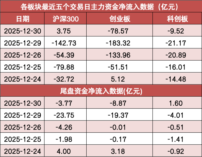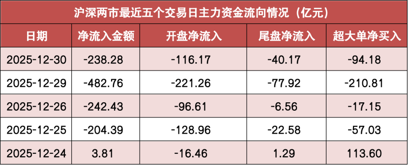 盘后数据出炉。 12月30日,A股窄幅整理,板块轮动较快。截至收盘,上证指数微跌报3965.12点,深证成指涨0.49%,创业板指涨0.63%,A股全天成交2.16万亿元。 1.两市主力资金净流出超230亿元 今日沪深两市主力资金开盘净流出116.17亿元,尾盘净流出40.17亿元,两市全天主力资金净流出238.28亿元。