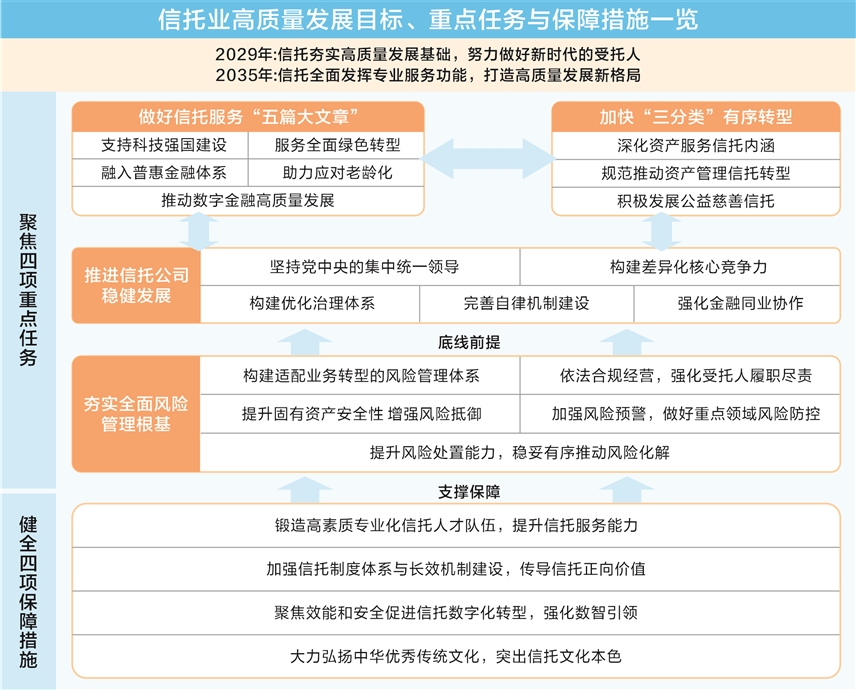 证券时报记者 刘敬元 身处转型变革期的中国信托业,正着手为未来十年的高质量发展作出系统规划。 近日,证券时报记者从多方采访独家获悉,监管部门已于年内指导中国信托业协会制订《中国信托业高质量发展规划(2025—2035)(征求意见稿)》(以下简称《规划》),并向信托公司征求意见。 总体上,《规划》明确了未来十年信托业发展的目标、重点任务和相关措施。 在信托公司未来发展目标方面,《规划》拟将其具体分为两个阶段:到2029年,信托夯实高质量发展基础,努力做好新时代的受托人;到2035年,信托全面发挥专业服务功能,打造高质量发展新格局。 锚定2029年和2035年的目标,《规划》进一步明确了未来十年的四大重点任务:一是做好金融“五篇大文章”,强化对国家战略的金融支撑;二是深化“三分类”转型,推动三大业务板块规范发展;三是提升受托服务能力,构建差异化发展核心竞争力;四是夯实全面风险管理根基,全面强化公司治理。 对于上述各项重点任务,《规划》都赋予了具体内容。例如,在金融“五篇大文章”的科技金融方面,《规划》提出,信托公司依托制度、场景及业务特色,强化科技强国信托支持,助力新质生产力发展。中短期内,提供科技金融资金支持,助力高科技企业研发、成果转化及规模扩张;开展知识产权信托,探索提供知识产权权益管理、保护、代际传承、公益慈善等服务。从长期来看,则提供权益资本、长期资本及耐心资本,覆盖科创企业全生命周期需求;搭建科技金融信托服务综合平台,整合提供政策咨询、技术对接、资金融通等综合服务。 与此同时,《规划》还明确了四项配套保障措施,涵盖人才培育、制度完善、数字化转型、文化建设。 《规划》提出,展望2035年,信托业强化使命担当、坚守本源定位,以实现行业高质量发展为核心目标,聚焦四项重点任务、健全四项保障措施,积极服务国家战略、助力经济社会高质量发展,推进金融强国建设,服务中国式现代化大局。 此次《规划》即将出台,具有多重背景。首先是中国式现代化提出了新要求,要发挥信托功能特点服务经济社会高质量发展,挖掘制度优势助力共同富裕;其次是金融强国赋予了新使命,要坚守金融工作的政治性、人民性,以服务实体经济为根本宗旨,牢牢守住不发生系统性金融风险的底线,践行中国特色金融文化;再次是高层指明了发展方向。国务院办公厅转发金融监管总局《关于加强监管防范风险推动信托业高质量发展的若干意见》,是信托业“1+N”制度体系的纲领性文件,对行业高质量发展起到引领作用;最后是金融“五篇大文章”指引了发展机遇。信托业对于高质量发展存在共同愿景,信托业市场需求潜力深厚,需要走出具有中国特色的高质量发展之路。 |