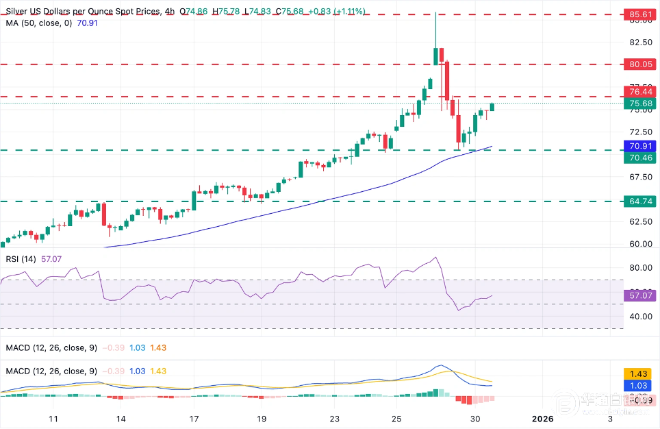 【华通白银网12月31日】•白银从70.40美元低点反弹至75.00美元区域。 •年终流动性稀薄引发了白银价格的剧烈波动。 •白银多头可能会在75.00美元上方遇到重大阻力。 在周一流动性稀薄的情况下,白银在周二贬值超过7%后,正逐步收复部分跌幅。全球不同地区不断升级的紧张局势,加上市场预期美联储会议纪要将巩固2026年进一步放松货币政策的希望,周二为白银提供了支撑。 美联储最近一次会议纪要,预计将反映出货币政策委员会内部的广泛分歧,并引发人们的希望,即美联储可能会将借款成本降低到点阵图中预测的25个基点之上。 技术分析:银价可能在76.50美元附近遇到阻力