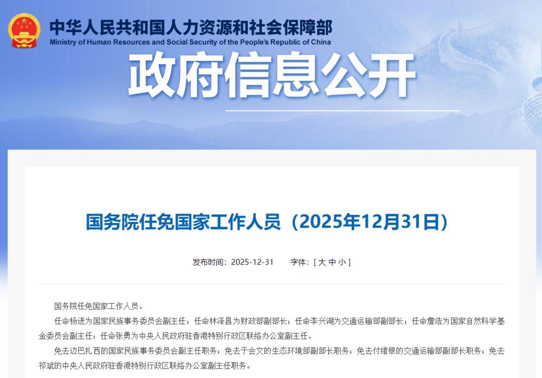 据人力资源和社会保障部网站12月31日消息,国务院任免国家工作人员。