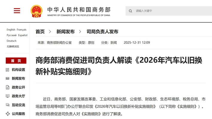 今天,商务部消费促进司负责人解读《2026年汽车以旧换新补贴实施细则》,明确参与申领2026年汽车报废更新补贴旧车的注册登记时间,相比2025年进一步扩大支持范围。 2026年汽车报废更新中: 若参与申领补贴的报废旧车为汽油乘用车,则其注册登记时间应在2013年6月30日(含当日,下同)之前; 若参与申领补贴的报废旧车为柴油及其他燃料乘用车,则其注册登记时间应在2015年6月30日之前; 若参与申领补贴的报废旧车为新能源乘用车,则其注册登记时间应在2019年12月31日之前。 此外,细则还明确,汽车以旧换新按照新车售价比例给予补贴,报废更新最高补2万元,置换更新最高补1.5万元;对符合条件的补贴申请,30个工作日内兑付补贴。 截至2025年12月28日,2025年汽车以旧换新超1150万辆,带动新车销售额超1.6万亿元。2025年国内乘用车零售量中,半数以上参与了汽车以旧换新。 消费者可通过电脑端登录“全国汽车流通信息管理系统”网站(https://qclt.mofcom.gov.cn),点击“汽车以旧换新”专题,进入申请页面,填写申请信息并上传所需附件。 责编:伍镆 一审:伍镆 二审:印奕帆 三审:谭登 来源:商务部 |