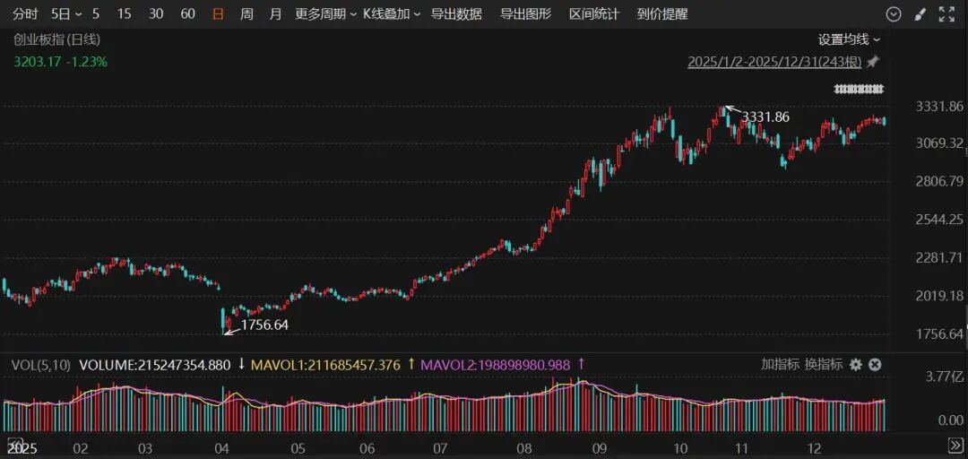 12月31日,是2025年最后一个交易日,A股整体小幅震荡,主要股指涨跌互现,上证指数微幅上涨,深证成指、创业板指、科创50等则小幅下跌,市场成交减少至2.07万亿元。 2025年A股市场行情正式收官,上证指数全年累计上涨18.41%,创最近6年来最大年度涨幅。 盘面上,航天设备、航空机场、酒店餐饮、人工智能等板块涨幅居前,林业、化纤、消费电子、光伏设备等板块跌幅居前。