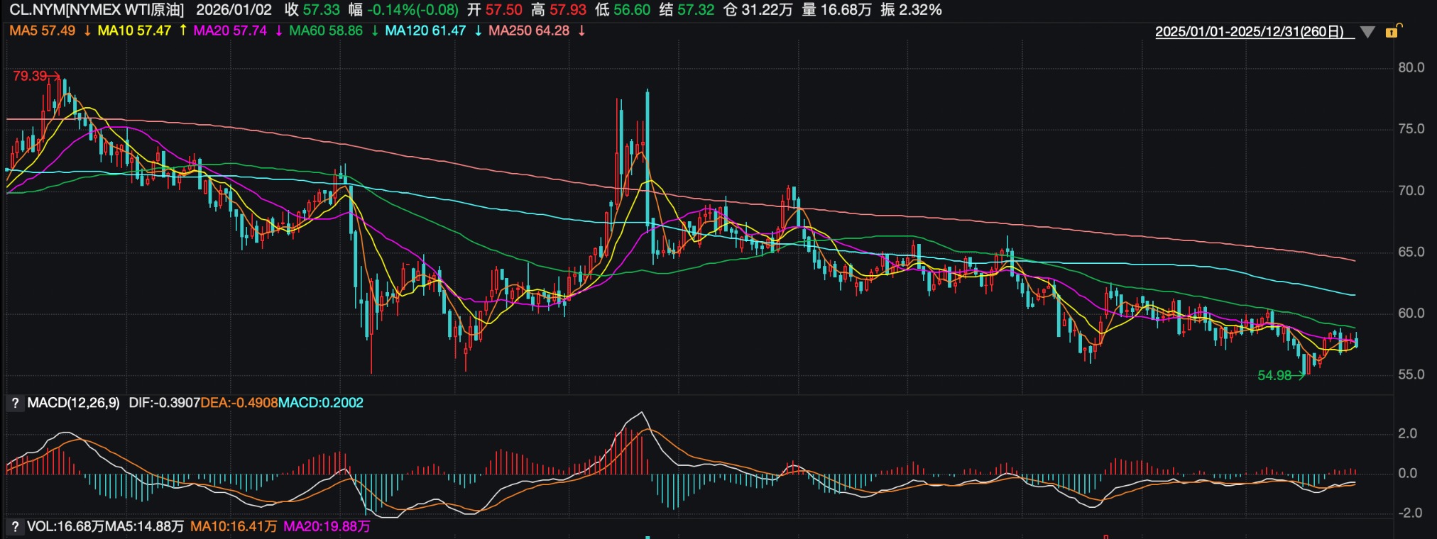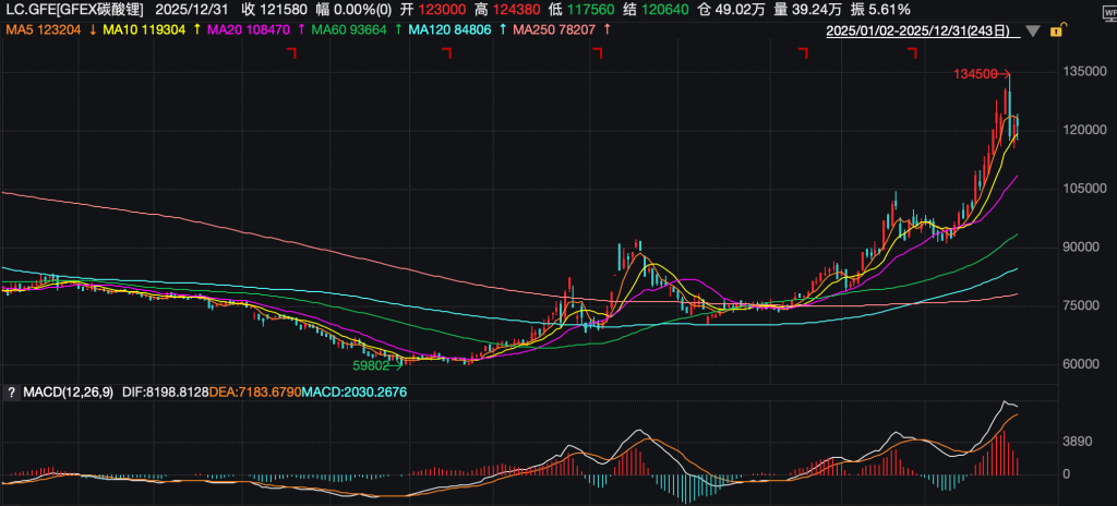 有色金属:铜价创新高,碳酸锂“V型反转” 2025年有色金属板块中,除铜、锡表现突出外,铝、镍等主要品种也走出差异化强势行情。铜作为板块龙头全年表现强劲,LME铜现货价格从年初的8500美元/吨左右起步,年末突破每吨价格一度飙升至12960美元,创下历史新高,全年涨幅超42%。 路博迈资源精选股票发起基金经理黄道立指出,2025年工业属性的力量和金融属性的力量共同支撑,形成了铜价的强势。从金融属性看,黄金的强势对铜价有一定的拉动作用。从工业属性来看, 2020年以后开启的绿色能源革命这一全球经济发展浪潮中,全球对电能的需求逐步提升。铜作为良好的导电性材料,在这一趋势下,其需求在新能源体系中消耗量逐步增加,从而在需求层面得到了支撑。 同时,随着贸易摩擦的升级,市场担心美国的关税政策会对未来的铜价形成扰动。2025年4月份以后,出现了美国市场抢购铜库存的现象。虽然全球铜库存处于历史中位水平,但从结构来看,美国的库存非常高,而其他地区的库存处于低位。黄道立表示,这种空间结构上的失衡,压缩了市场流通铜的供应,进一步提升了铜价。 其他工业金属也普遍走强。铝价全年上涨17%,主要受益于再生铝产能优化与新能源汽车轻量化需求增长。镍价波动相对剧烈,沪镍主连期货合约年初开盘约11.7万元/吨,年末重新站上13万元/吨关口,年内经历多轮区间震荡,四季度末受新能源电池材料需求提振出现一波快速拉升行情。 碳酸锂走势呈现“先抑后扬”的宽幅震荡特征,广期所碳酸锂期货主力合约价格2025年年初从7.52万元/吨震荡下行,2025年6月下旬一度跌破6万元/吨关口,下半年受矿端减产扰动及储能需求爆发拉动,价格快速上行,2025年12月29日,价格一度冲高至13.45万元/吨,较年内低点累计涨幅超过120%。 ![]() 一德期货指出, 2025年碳酸锂的行情并非简单的V型反转,而是经历了一场从阴跌寻底到大举反弹,回调后进而再创年内新高的希望中复苏型行情。 展望2026年,花旗集团向客户建议,在美元走软和美联储降息进一步提升铜吸引力的“牛市情景”下,铜价可能触及15000美元,从而促使投资者更激进地涌入市场。 中信建投认为,催化2025年史诗级别行情的金价上涨背后的三大宏观叙事,美联储货币宽松、科技催生新产业周期、全球供应链重塑恰好成为推升2026年铜价的因素,会推升铜价迎来历史级别上涨。 伯恩斯坦与德意志银行预计,锂在经历了2025年的出清后,2026年将迎来供需反转,碳酸锂均价有望回升至14000-18000美元/吨。 华泰期货表示,碳酸锂消费端预期目前均较乐观,但实际兑现情况仍有待观察,整体供需格局预计有所好转,过剩量收窄,预计2026年碳酸锂价格将会在7万元-13万元/吨运行,由于行业整体过剩收窄,价格重心会或出现抬升。 能源:供应过剩压顶,原油愁云惨淡 2025年国际油价全年走势疲软,WTI原油2025年12月31日收盘跌0.95%,报57.46美元/桶;布伦特原油2025年12月31日收盘跌0.73%,报61.3美元/桶。WTI原油全年跌约20%,第一季度一度飙升至82.03美元/桶,但随后恢复下行趋势,一度跌至55美元/桶附近;布伦特原油全年跌约18%,创下自2020年来最大年度跌幅。 ![]() 光大期货研究所副所长钟美燕指出,2025年国际原油市场一波三折,全年呈三阶段走势:年初自高点回落,主要受宏观压力与贸易环境变化冲击;年中因地缘冲突出现急涨急跌,创下次高点;三季度后重心持续下移,波动收窄,年末刷新年内低点。 Kotak Securities分析师Kaynat Chainwala表示:“石油市场供过于求的局面将持续到2026年,美国、巴西、圭亚那和阿根廷等非OPEC国家的强劲产量将超过全球参差不齐的需求增长。”她补充道,油价预计将在50至70美元之间波动,而针对委内瑞拉或俄罗斯供应的潜在风险将起到一定的支撑作用。 展望2026年,市场普遍认为,原油难有系统性上涨机会。 高盛指出,疫情前批准的长周期项目将在2026年集中苏醒,叠加OPEC+解除减产的战略选择,2026年全球原油市场日均过剩量将达200万桶,这一波供应浪潮预计在2026年底才能画上句号。该投行预计,布伦特原油2026年均价为56美元/桶,WTI原油为52美元/桶,油价将在年中触底,四季度开始回升,2028年底逐步回升至80美元/桶水平,经历一场漫长的“触底反弹”。 摩根大通的预测同样偏悲观,其预计,2026年布伦特原油和WTI原油均价分别为58美元/桶和54美元/桶,核心逻辑是今明两年供应增速将达到需求增速的三倍,市场宽松格局难改。 南华期货认为,2026年宏观层面对原油需求的边际支撑有限,需求增长弹性持续走弱,难以对冲非OPEC产油国的确定性增量,而OPEC+更可能通过灵活调节产量以管理过剩而非主动收紧供给,油价缺乏趋势性上行基础。与此同时,低油价对供需两端的反向调节效应正在显现,过剩压力具备边际缓和空间。该机构预测布伦特原油2026年全年的运行区间在55-75美元/桶,整体呈区间运行、前低后稳特征,更可能处于周期性筑底阶段,而非新一轮下行周期的起点。 值得一提的是,美军空袭委内瑞拉成为2026年全球市场的第一只黑天鹅。据新华社报道,美国东部时间3日上午11时40分左右(北京时间4日零时40分左右),美国总统特朗普在佛罗里达州海湖庄园举行新闻发布会,披露更多关于军事打击委内瑞拉、抓走委总统马杜罗的细节。特朗普说,美国大型石油公司将前往委内瑞拉,“我们将让美国那些规模庞大的石油公司——它们是全球最大的石油企业