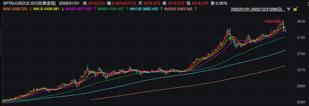 2025年,全球大宗商品市场在复杂多变的宏观环境中,呈现“冰火两重天”的极致反差。 一边是金银等贵金属开启史诗级牛市,白银涨超146%创下有史以来最大年度涨幅,黄金上涨超过60%,工业金属强势反弹并屡创历史新高,成为市场瞩目的上涨主线;另一边是能源深陷低谷,价格持续回落,承受供需失衡与需求疲软的双重压力,WTI原油全年均下跌超18%,录得2020年以来最大年度跌幅。 展望2026年,市场观点认为,金属市场的需求根基仍然十分稳固,而原油难有系统性上涨机会。 贵金属:白银狂飙,黄金连续创纪录 2025年贵金属板块成为大宗商品市场的绝对主角,各品种全面走强且走势各具特色。 黄金全年涨幅超60%,价格从年初的2650美元/盎司一路飙升至4000美元/盎司上方,年内逾50次突破历史峰值,年末更是一度触及4500美元/盎司的高位。白银涨势更为迅猛,伦敦银现货价格年内累计最大涨幅一度超170%,虽年末出现单日超10%的跳水,但全年仍实现约150%的年度涨幅。铂、钯则后来居上,成为年末市场焦点,现货铂金全年涨约128%,一度刷新历史高位至2478美元/盎司,仅2025年12月单月涨幅就创下39年来最强劲表现;现货钯金全年涨约80%,一度刷新年内高位至1983美元/盎司。 ![]() 国泰海通证券表示,“去美元化”的长期趋势下,部分国家降低外汇储备中美债占比、增持黄金的驱动持续存在。而美联储的降息周期带来的流动性宽松,在一定程度上加速了这一进程,2025年让市场见证了这两种趋势叠加下的贵金属上涨。 展望2026年,世界黄金协会美洲CEO兼全球研究负责人安凯认为,黄金市场将进入多重力量交织、动态平衡的新阶段。一方面,地缘经济不确定性依然高企,美元或将延续弱势,投资者和央行的结构性需求有望持续为金价提供支撑。另一方面,全球经济复苏的可能性、利率周期的变化以及美元阶段性反弹等因素,也可能对黄金价格形成一定压力。 全球贵金属行业知名企业贺利氏贵金属发布预测报告认为,金、银和铂族金属价格在2026年上半年很可能呈现下行趋势。此前的涨势曾将黄金和白银推至历史高位,也令铂族金属价格创多年新高,不过涨幅过快过高。虽然价格短期内仍可能上行,但一旦动能减弱,预计贵金属价格将迎来盘整。持续的央行购金、持续的通胀以及较低的实际利率等关键因素可能支撑价格。然而,工业需求疲软和衰退风险对铂族金属构成较大的下行压力。 经纪商KCM Trade首席市场分析师Tim Waterer表示:“无论从工业需求还是零售投资需求来看,目前金属市场的需求根基都十分稳固。”