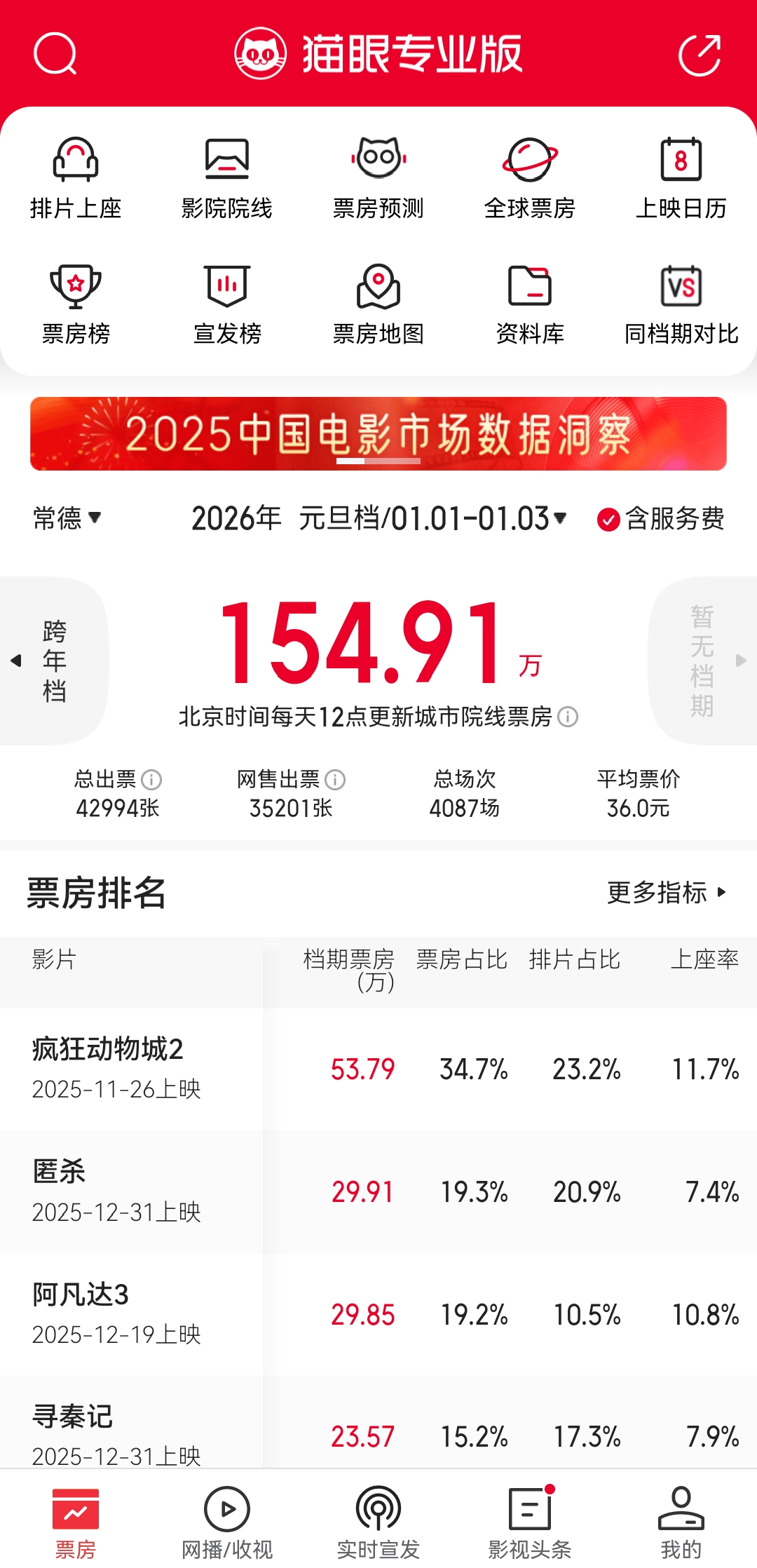 红网时刻新闻1月5日综合(常德日报记者 李张念)1月4日,猫眼专业版显示,2026年常德元旦档(1月1日至3日)电影票房为154.91万元,城市院线超4.2万观影人次,放映总场次为4087场。