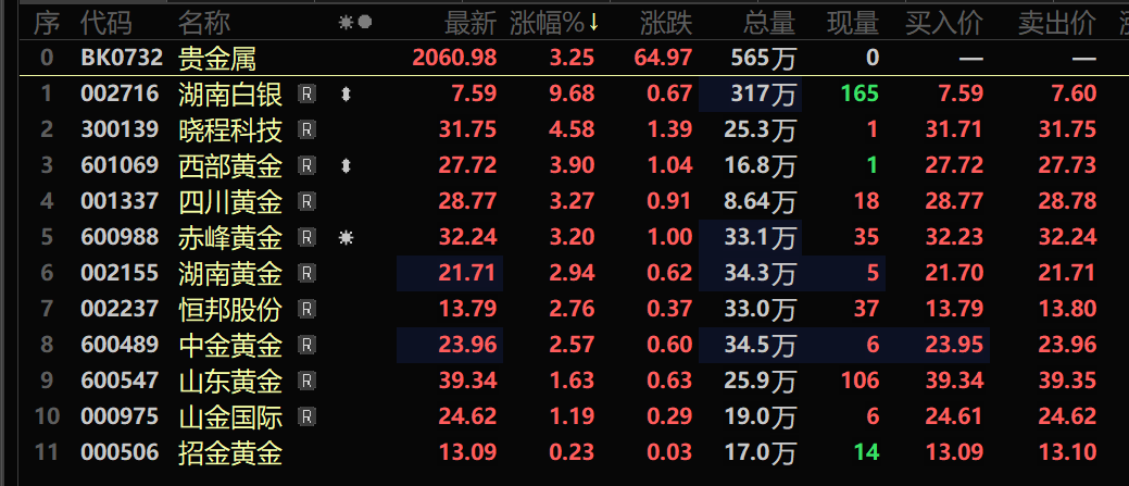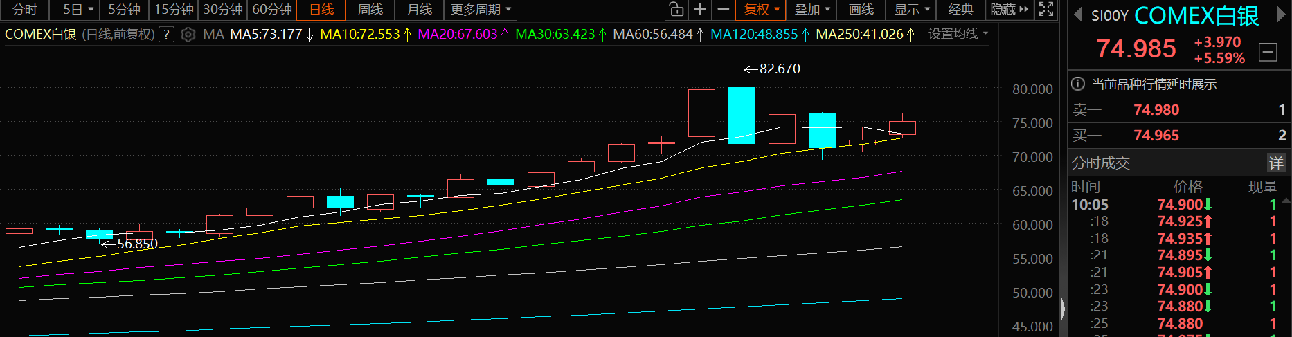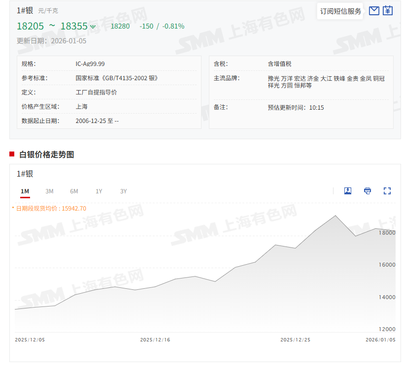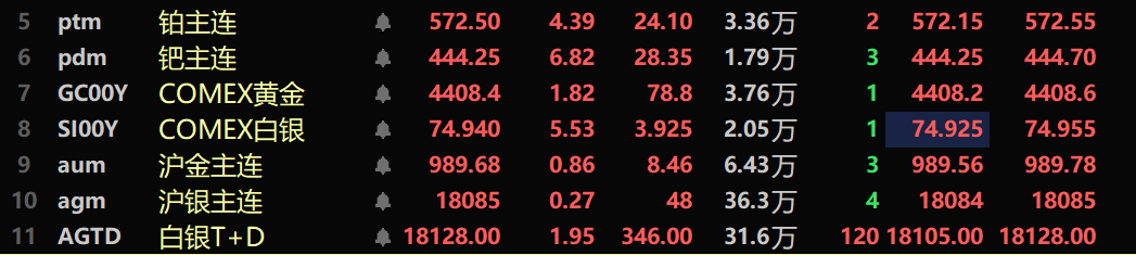SMM1月5日讯: 美国对委内瑞拉采取相关军事行动、俄乌冲突持续发酵等地缘局势变化,引发市场对地缘风险的担忧升温,避险需求显著攀升,为贵金属价格上行提供强劲支撑。此外,美联储降息预期主导的货币宽松周期预期未发生转向,市场对流动性宽松的判断进一步强化贵金属配置价值;多国央行延续增持黄金的操作,为贵金属市场注入长期稳定支撑;白银市场供应偏紧格局延续,尽管国内工业领域交投氛围相对清淡,但珠宝加工等领域的原料采购需求及投资端配置积极性较高,对银价形成有力提振;铂钯品种基本面持续向好等共同推动贵金属期、股价格联袂走强。截至1月5日10:15分左右,铂主连期货涨4.39%,报572.5元/克;钯主连涨6.82%,报444.25元/克;COMEX黄金涨1.82%,报4408.4美元/盎司;沪金主连涨0.86%,报989.68元/克;COMEX白银涨5.53%,报74.97美元/盎司;沪银主连涨0.27%,报18085元/千克;白银T+D涨1.95%,报18128元/千克。 股市方面,截至1月5日11:12分左右,贵金属板块涨3.25%,个股方面:湖南白银以9.68%的涨幅领涨。晓程科技、西部黄金、四川黄金以及赤峰黄金等涨幅居前。