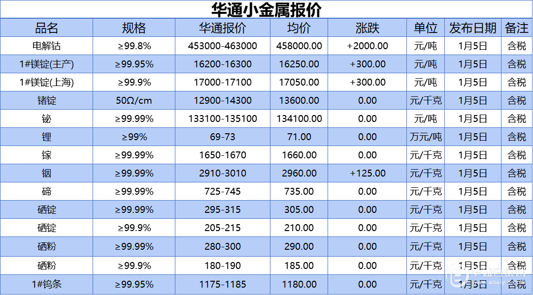 华通白银网 1月5日讯:电解钴、1#镁锭(生产)、1#镁锭(上海)、锗锭、铋、锂、镓、铟、碲、硒锭(99.99%)、硒锭(99.9%)、硒粉、硒粉(99.9%)、1#钨条报价