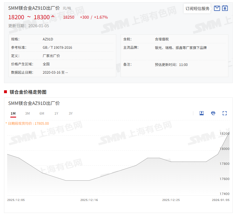 》点击查看SMM金属镁现货价格 》订购查看SMM金属现货历史价格走势 据SMM报价显示:镁合金AZ91D1月5日的报价为18200~18300元/吨,其均价为18250元/吨,较前一交易日涨1.67%。 近日镁合金价格偏强运行。原材料方面,元旦节后,镁锭价格单日跳涨200元/吨,镁合金基准价格稳步上调。供应端方面,厂商满产运行,多数以订单排产为主,市场供应持续偏紧;需求端,新能源汽车与两轮电动车订单稳步释放,需求增长幅度明显快于供应。综合判断,预计镁合金价格仍将偏强运行。 推荐阅读: 》2025年镁市冷暖不均 镁锭承压与镁合金紧缺并存 2026年下游爆发能否引领全产业链逆袭?【SMM国内分析】 |