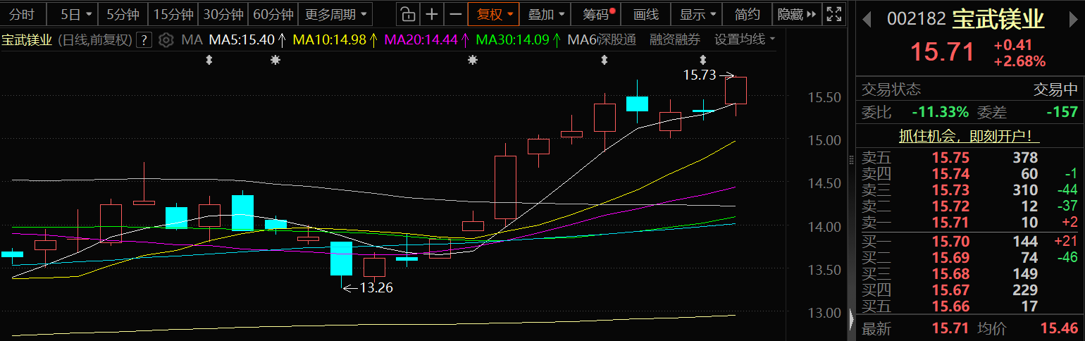 1月5日,宝武镁业的股价出现上涨,截至5日13:35分,宝武镁业涨2.68%,报15.71元/股。