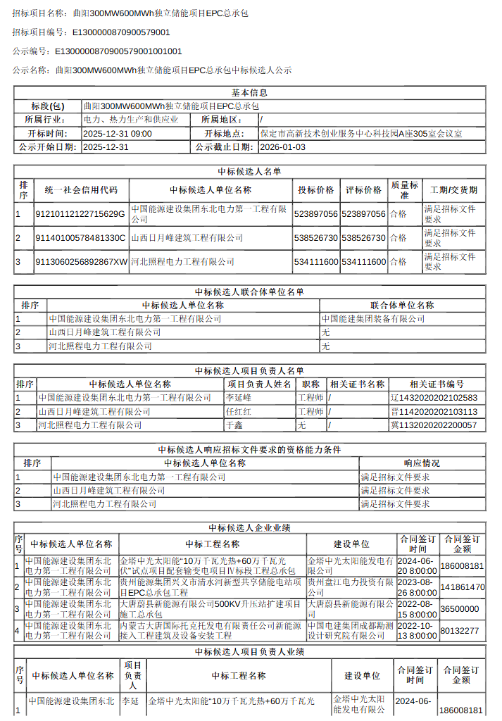 北极星储能网获悉,12月31日,河北保定市曲阳县300MW600MWh独立储能项目EPC总承包中标候选人公示,中标候选人名单包括中国能源建设集团东北电力第一工程有限公司,投标价格5.24亿元,约合0.873元/Wh;山西日月峰建筑工程有限公司,投标价格5.39亿元,约合0.898元/Wh;河北照程电力工程有限公司,投标价格5.34亿元,约合0.89元/Wh。 据招标公告,该项目招标人为曲阳聚储达新能源科技有限责任公司,招标代理机构为河北诚工程管理服务有限公司,建设地点位于河北省保定市曲阳县,本项目估算金额54000 万元。新建储能电站安装108套锂离子电池集装箱、24 套钠离子电池集装箱,配套变流升压一体机相关设备等设施。 此前开标记录显示,共有四家投标,包括中振建设有限公司、山西日月峰建筑工程有限公司、中国能源建设集团东北电力第一工程有限公司、河北照程电力工程有限公司。 原文如下: