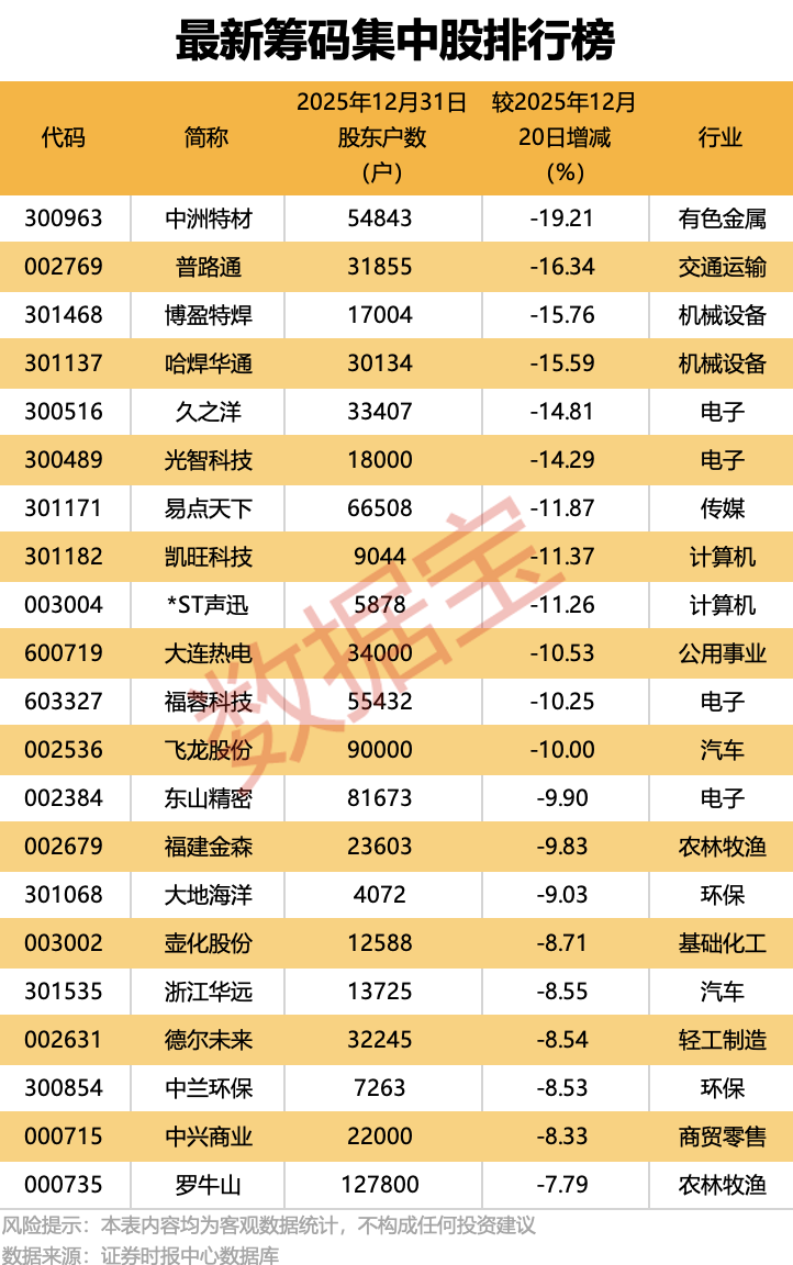 11股最新股东户数降幅超10% 统计显示,共有379股公布了截至2025年12月31日股东户数,与上期(2025年12月20日)相比,股东户数下降的有190股,其中股东户数降幅超一成的有11股。 股东户数降幅最多的是中洲特材,截至2025年12月31日,公司最新股东户数为54843户,较上期下降19.21%;其次是普路通,最新股东户数为31855户,较上期下降16.34%。