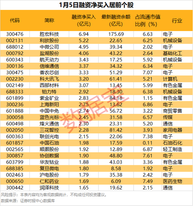 17股杠杆资金净买入超2亿元 截至1月5日,市场融资余额合计2.54万亿元,较前一交易日增加192.66亿元。 具体到个股,1月5日获融资净买入在1亿元以上的有63股,其中,17股融资净买入额均超2亿元。 胜宏科技融资净买入额居首,当日净买入6.94亿元;其次是利欧股份、中微公司,融资净买入金额分别为5.22亿元、4.95亿元。 融资净买入金额居前的还有盐湖股份、航天动力、信维通信等。 分行业统计,获融资客净买入均超1亿元个股中,电子、有色金属、非银金融等行业最为集中,分别有14股、9股、5股上榜。