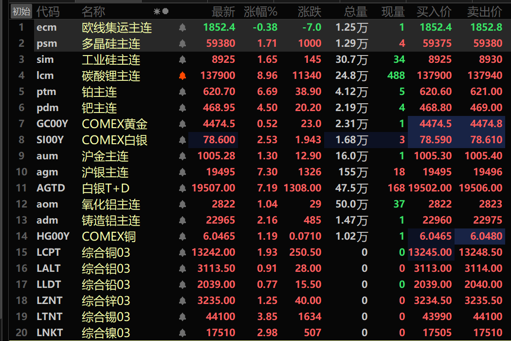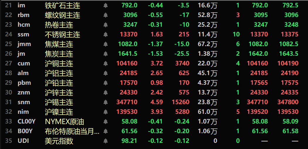 SMM1月6日讯: 金属市场方面: 截至午间收盘,内盘基本金属全线上涨,沪铜涨3.72%。沪铝涨2.65%。沪铅涨0.98%,沪锌涨2.42%。沪锡涨4.59%,沪镍涨3.93%。 此外,铸造铝主连期货涨2.16%,氧化铝主连涨1.04%。碳酸锂主连涨8.96%。工业硅主连涨1.65%。多晶硅主连涨1.71%。 黑色系多飘绿,铁矿跌0.44%,螺纹跌0.55%,热卷跌0.31%,不锈钢涨1.63%。双焦方面:焦煤主力合约跌1.37%,焦炭主力合约跌1.53%。 外盘基本金属方面,截至11:40分,LME金属全线上涨。伦铜涨1.93%,伦铝涨0.91%。伦铅涨0.77%。伦锌涨1.25%。伦锡涨3.85%。伦镍涨2.98%。 贵金属方面,截至11:40分,COMEX黄金涨0.52%;COMEX白银涨2.53%。内盘贵金属方面:沪金主连涨1.3%,沪银主连涨7.3%。 此外,截至午间收盘,铂主连期货涨6.69%,钯主连期货涨4.5%。 截至午间收盘,欧线集运主力合约跌0.38%,报1852.4点。 截至1月5日11:40分,部分期货午间行情: