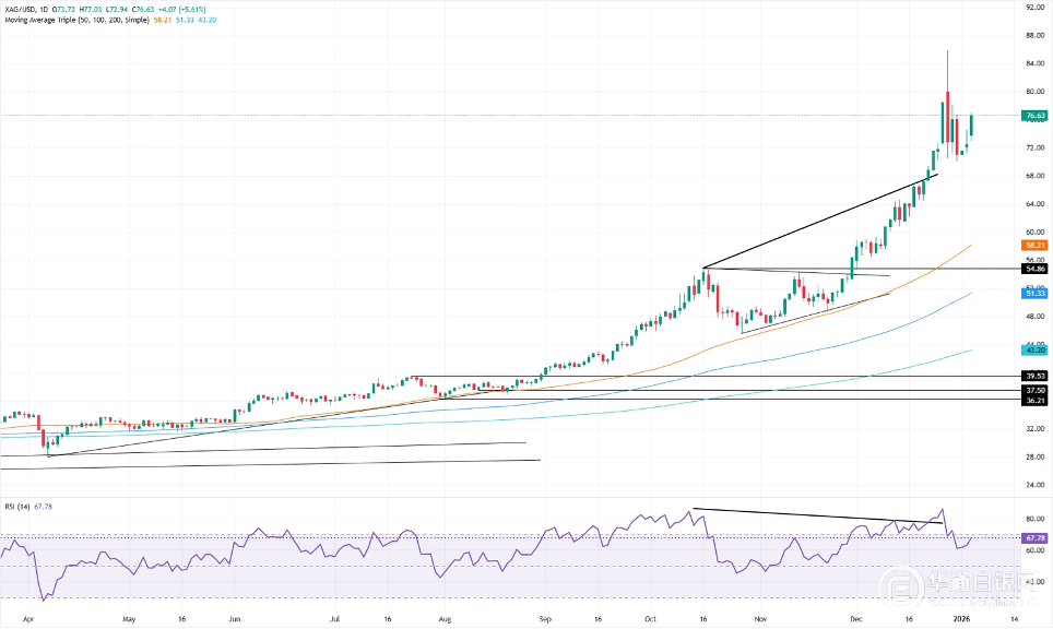 尽管美元走强,但由于地缘政治动荡,白银飙升逾4% 市场情绪喜忧参半。贵金属在上涨,股票也在上涨,美国股市上涨了0.24%至0.89%。在外汇领域,美元强势回归,上涨0.22%,这对大多数10国集团外汇货币来说是一个不利因素。 尽管如此,在美国总统特朗普表示美国将“统治”委内瑞拉后的不确定性中,贵金属可能会延续涨势。此外,他补充称,如果由副总统德尔西·罗德里格斯领导的现任政府不与美国合作,他们可能会重复这次行动。 当被问及这一问题时,特朗普表示,如果哥伦比亚和墨西哥不减少毒品的流动,军事行动可能会扩大到这两个国家。 截至撰写本文时,美国ISM制造业采购经理人指数(PMI)低于预期的48.3,为47.9,表明制造业状况恶化。 接下来,美国经济数据将包括ISM服务业PMI、截至1月3日当周初请失业金人数以及12月非农就业数据。 白银价格分析:技术展望 银价上行趋势保持不变,但在触及三天高位后似乎延伸过度,且动能显示出减弱迹象。相对强弱指标(RSI)虽然看涨,但未能突破最近的峰值。这意味着回调的可能性正在逼近。 然而,白银阻力最小的路径是上行。下一个关键阻力位是12月30日的高点78.06美元,随后是79.00美元和80.00美元。另一方面,如果银价跌破75.00美元,下一水平将是1月2日高位74.55美元的支撑位,之后是74.00美元/盎司。 截止北京时间09:40,华通现货白银定盘价报18815元。