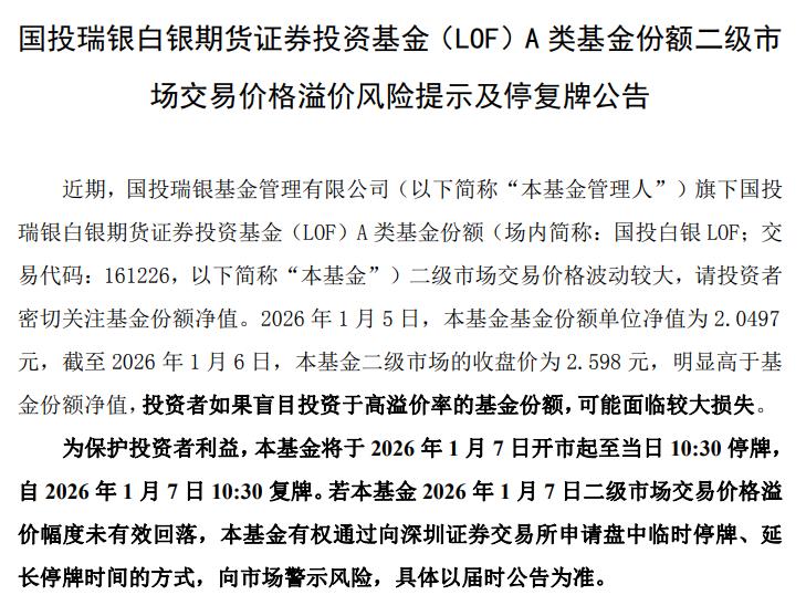 国投瑞银基金管理有限公司1月6日公告,近期,国投瑞银基金管理有限公司旗下国投瑞银白银期货证券投资基金A类基金份额二级市场交易价格波动较大,请投资者密切关注基金份额净值。为保护投资者利益,本基金将于2026年1月7日开市起至当日10:30停牌,自2026年1月7日10:30复牌。若本基金2026年1月7日二级市场交易价格溢价幅度未有效回落,本基金有权通过向深圳证券交易所申请盘中临时停牌、延长停牌时间的方式,向市场警示风险,具体以届时公告为准。