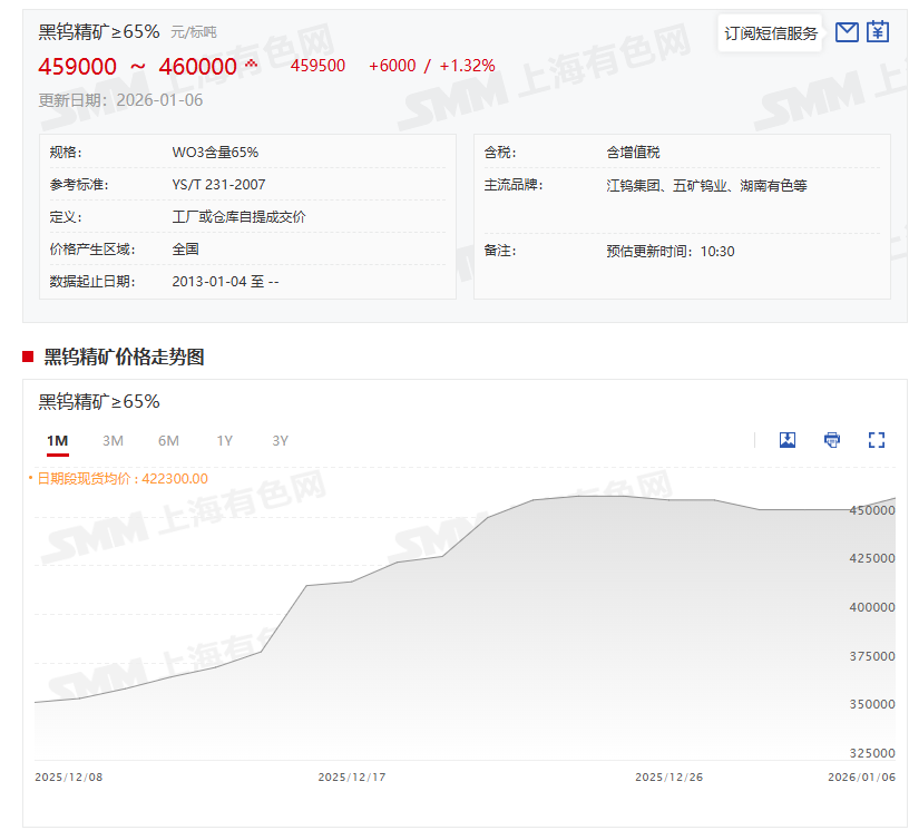 》点击查看SMM钨现货价格 》订购查看SMM金属现货历史价格走势 随着多家钨企上调长单报价,钨价出现反弹。据SMM报价显示,1月6日,黑钨精矿(≥65%)价格为459000~460000 元/标吨,均价报459500元/标吨,较前一交易日上涨1.32%。 目前钨矿和仲钨酸铵流通偏紧格局短期难以缓解,其价格重心均出现了上移。钨粉方面虽然也跟着上游价格小幅上调了报价,不过,鉴于粉末企业多按订单生产,新一轮的补库周期尚未来临,市场观望情绪浓厚,供需博弈加剧,等待实单跟进。值得一提的是,节前废钨市场避险变现释放,贸易商库存低位的情况下,补库需求增加,市场成交相对活跃,废钨成交价格较前期有所上涨。 后市 短期来看,节前钨市场持货商获利了结后,节后市场存在补库需求,部分持货商封底补库,带动短期成交量好转。短期钨供应偏紧局面将继续给钨价带来较强的支撑。中长期来看,在第一批指标下发之前,矿山超采超卖的可能性不大,多以维稳出货为主,钨矿供应也难有供应宽松预期,而下游APT暂未听闻集中检修的情况,矿端需求支撑较稳,加之春节前的备库时节来临,春节前钨矿的需求仍维持增量看待。从终端角度上来看,市场短期难以找到很好的替代材料去替代钨市场份额,加大再生钨回收利用或能缓解部分原料端高位压力,但废钨库存经过节前的一波抛售也逐步出清,综合来看,SMM预计一季度钨市场供需上仍会出现上游供应紧张的局面,从而驱动整个钨市场维持高位震荡。此外,需关注国务院印发《固体废物综合治理行动计划》和商务部公告2026年第1号 《关于加强两用物项对日本出口管制的公告》等政策对钨行业的指引作用。 推荐阅读: 》节后钨市场持稳运行 废钨市场率先探涨【SMM钨日评】 》废钨市场年前出清库存 一季度市场仍或高位为主【SMM钨评】 》商务部:加强两用物项对日本出口管制 自公布之日起正式实施 》国务院印发关于《固体废物综合治理行动计划》的通知 |