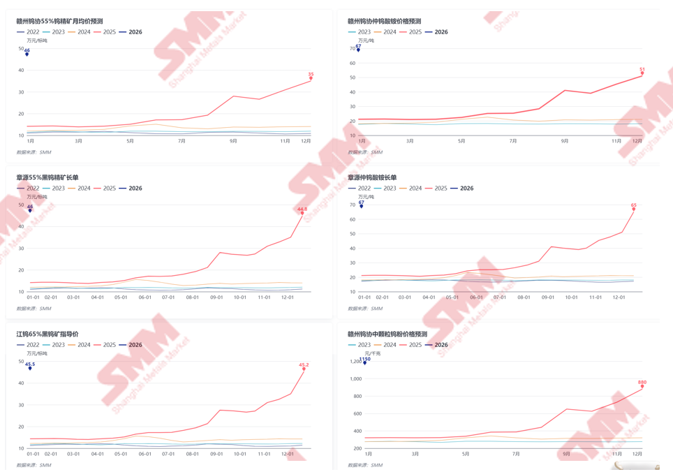》点击查看SMM金属钨产业链数据终端 多家钨企均上调了1月上半月的长单报价,具体如下: 江西钨业控股集团有限公司国标一级黑钨精矿2026年1月上半月指导价45.5万元/标吨,较12月下半月上调0.3万元/标吨。 崇义章源钨业股份有限公司1月上半月的长单采购报价如下:1. 55%黑钨精矿:46万元/标吨,较上轮报价上调1.2万元/标吨;2. 55%白钨精矿:45.9万元/标吨,较上轮报价上调1.2万元/标吨;3. 仲钨酸铵(国标零级):67万元/吨,较上轮报价上调2万元/吨。 赣州市钨业协会2026年1月份钨市场预测价:55%黑钨矿46万元/标吨,环比上调11万元/标吨;APT67万元/吨,环比上调16万元/吨;中颗粒钨粉1150元/公斤,环比上调270元/公斤。(价格仅供参考,商业风险自理) 钨产业链6日迎来全线反弹 黑钨精矿当日涨1.32%