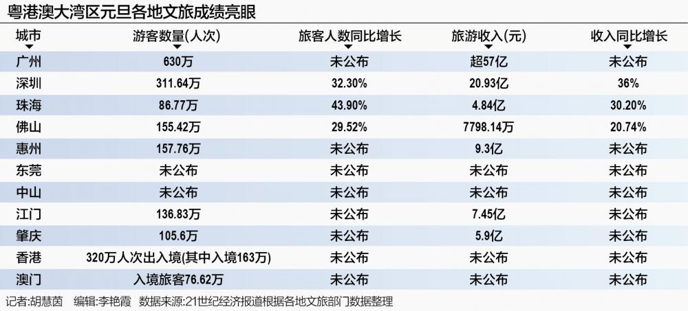 文旅“人财两旺” 2026年元旦假期的粤港澳大湾区,从核心都市圈到粤东粤西沿海,从一线城市到县域乡村,处处涌动着旅游热潮。 “大湾区文旅的核心优势在于‘多元融合’与‘市场活力’。”联合国旅游组织专家贾云峰在接受21世纪经济报道记者采访时表示,一方面,大湾区拥有丰富的自然资源与人文资源,从滨海休闲到森林康养,从广府文化到潮汕风情,形成了多层次、全域化的产品体系;另一方面,大湾区城市经济发达、交通便利,消费市场成熟,并且注重文旅产品的创新与市场化运营。 其中,“霸榜”全国前十最热门旅游目的地等各大文旅榜单的广州和深圳持续为大湾区带来滚滚客流。广州作为“千年商都”,主打精品演出和文博展览吸引游客眼球。元旦期间,广州推出超500场文旅活动,累计接待游客超630万人次,实现文旅消费超57亿元。深圳也以一系列充满“国际范”的文旅活动迎接八方来客。据统计,元旦期间深圳累计接待游客311.64万人次,日均同比增长32.3%;实现旅游收入20.93亿元,日均同比增长36%。 作为全国重要的游客集散地和交通枢纽,广州、深圳在元旦假期尽显双城魅力。通过相关旅游数据可以得知,广东的旅游收入增速显著高于接待人次增速,背后的原因在于粤港澳大湾区文旅呈现各城市“百花齐放”的格局。元旦期间,也有不少二线乃至县域城市的文旅成绩单以“黑马”之姿跑出。 携程数据显示,“湾区黑马”清远凭借粤港澳大湾区“一小时生活圈”的地理优势,旅游订单量实现774%的增长,增速全国第一;得益于“2025—2026葫芦果音乐节”,佛山的旅游订单增长306%。另外,去哪儿旅行数据显示,广东南澳县进入全国TOP热门县城榜单,吸引大量游客前往。 同程研究院首席研究员程超功向21世纪经济报道记者表示,广深“双核驱动”构建了大湾区文商旅深度融合的发展布局。在广深之外,其他的大湾区城市在文旅市场发展方面各有千秋,尤其是在传统文化、生态风景、高端度假等领域的竞争优势较为突出,元旦期间大湾区各地市文旅市场在本地周边消费与跨城出游均保持了良好的增长势头。 大湾区各城市文旅相继“出圈”,部分原因还在于游客旅游模式变得更多元化。 据广东省文旅厅有关负责人介绍,游客出行以中短途、本地游、周边游为主,森林康养、滨海温泉、乡村民宿、亲子研学等主题游备受青睐,文旅融合深度推进。比如,云浮市南山公园、龙湾风车山、金台山公园等乡村及生态点位客流充盈;中山市以乡村咖啡节为契机,推动“乡村场景+品质消费”;珠海斗门、金湾等地推出了融合非遗与农耕体验的乡村路线。 “这种多元化的旅游发展格局,与区域经济的腾飞、旅游市场的持续培育密不可分。”澳门城市大学国际旅游与管理学院执行副院长李玺向21世纪经济报道记者表示,随着经济水平稳步提升,人们的旅游需求也会逐步升级——从最初单纯的观光游览,转变为更侧重度假休闲的深度体验。与此同时,大众对个性化体验的追求,也让各类主题游、特色游项目一跃成为市场热点。正是在供需两端的双重驱动下,粤港澳大湾区多元化的旅游产品与市场才得以展现出强劲的发展势头。 李玺特别提到,自“澳车北上”“港车北上”政策常态化实施后,乡村旅游资源顺势成为大湾区旅游发展中极具比较优势的特色增长点,而珠江西岸的乡村旅游资源被全面激活,也吸引着港澳居民纷纷开启深度乡村游的体验模式。 “文旅+”释放消费活力 佛山南海体育中心、香港启德体育园……几乎同一时间,多场跨年演唱会在粤港澳大湾区核心城市绽放。这个元旦假期,演艺经济点燃了城市的“烟火气”。 当“为一场演出奔赴一座城”成为潮流新风尚,相关的文旅、食宿、购物等综合消费也迎来升温。元旦期间,飞赴广州、深圳、珠海、佛山的游客人数均实现翻倍增长,整体增幅领跑全国。酒店预订量也随之增长。同程旅行报告显示,演唱会等演出集中区域如广东奥体中心、宝能演艺中心等商圈,酒店预订热度同比增长超2倍。 香港同样因跨年活动和多场演唱会的举办热闹非凡。香港美丽华集团首席营运总裁陈宗彝表示,2026年元旦假期延续圣诞节的旺势,大量旅客南下香港度假,带动本港酒店入住率普遍达到100%水平。 元旦期间,各类演唱会、跨年盛会点燃大湾区文旅热浪,另外,大湾区各地的体育活动同样“遍地开花”。广州、中山、汕尾、湛江等地举办村BA、足球赛、篮球赛、风筝嘉年华、传统武术展演等活动,呈现十足的活力。 很显然,演出的辐射半径远超舞台和赛场本身。据行业测算,一场大型演出的关联消费(餐饮、住宿、文创等)占比可达总消费的30%~50%。 在程超功看来,大型演唱会、音乐节及大型体育赛事活动本身就是一个巨大的“流量入口”,可以在短时间内大幅拉高城市的跨城游客流量,从而带动当地的交通、住宿、餐饮、购物及文旅景点的客流量增长。他还表示,持续举办的大型演出赛事对于塑造年轻有活力的城市形象也具有长期价值,还是提升城市文旅市场活力的重要举措,对拉动跨城游乃至入境游具有积极意义。 不少粤港澳大湾区的城市还将“票根经济”作为拉动消费的新引擎。比如广州南沙,推出了“凭赛事票根享景区折扣、合作酒店优惠”等联动政策,成功引导观众从“看完就走”转变为“停留消费”。深圳也推出了赛事“票根