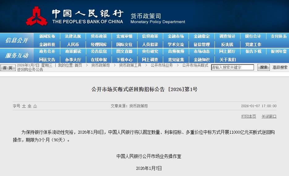 为保持银行体系流动性充裕,2026年1月8日,中国人民银行将以固定数量、利率招标、多重价位中标方式开展11000亿元买断式逆回购操作,期限为3个月(90天)。