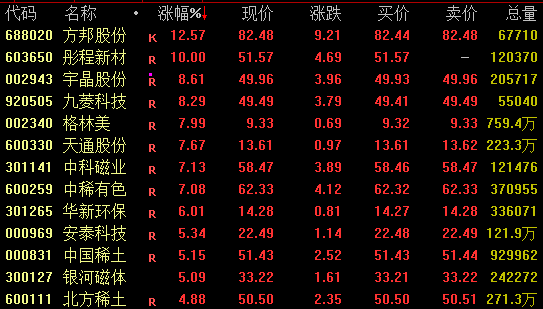 期货市场方面,焦煤、焦炭主力合约午后双双涨停。机构表示,元旦后中东部低温将推升供暖需求,叠加供给收缩、政策托底预期,煤价有望止跌企稳。 信达证券指出,元旦后我国中东部大部地区平均气温将由前期显著偏高转为偏低1—2℃,煤炭消费端支撑力度有望增强,叠加当前长协与市场煤价格再次倒挂,自7月以来的供给端约束底层逻辑仍然存在,无需过度担忧煤价大幅下跌,静待需求边际改善或政策引导信号出现,煤价企稳节点正在逐步临近。能源大通胀背景下,未来3—5年煤炭供需偏紧的格局仍未改变,优质煤炭企业依然具有高壁垒、高现金、高分红、高股息的属性,叠加煤价筑底推动板块估值重塑,板块投资攻守兼备且具有高性价比,短期板块回调后已凸显出较高的投资价值。 稀土概念崛起 稀土板块盘中强势拉升,截至收盘,方邦股份涨超12%,中科磁业、中稀有色涨超7%,中国稀土涨逾5%。