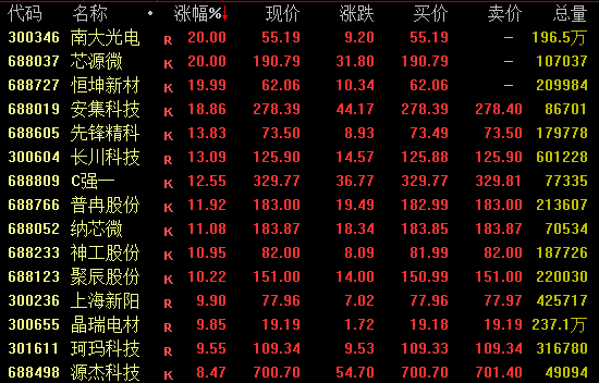 具体来看,沪指盘中震荡上扬,午后一度回落,尾盘再度翻红,连续14日收阳;科创50指数较为强势。截至收盘,沪指微涨0.05%报4085.77点,深证成指涨0.06%,创业板指涨0.31%,科创50指数涨0.99%,沪深北三市合计成交约2.88万亿元,较此前一日增加近500亿元。 全A近3200股飘绿,人脑工程概念跳水,诚益通、爱朋医疗等跌超10%;券商、石油、银行等板块走低;煤炭板块强势拉升,大有能源、陕西黑猫等涨停;半导体产业链股强势,光刻机、存储芯片、先进封装等细分领域个股集体爆发,芯源微、普冉股份、兆易创新等创新高;稀土概念崛起,中科磁业、中稀有色等飙升;值得注意的是,市值超千亿的金风科技尾盘直线拉升封涨停,全日成交168.5亿元,位居A股成交额第四。 半导体产业链股强势 光刻机、存储芯片、先进封装等半导体产业链股盘中集体爆发,截至收盘,南大光电、芯源微、恒坤新材等20%涨停,安集科技涨近19%,普冉股份涨近12%,北方华创涨逾6%、兆易创新涨近5%。值得注意的是,芯源微、普冉股份、北方华创、兆易创新等盘中均创历史新高。