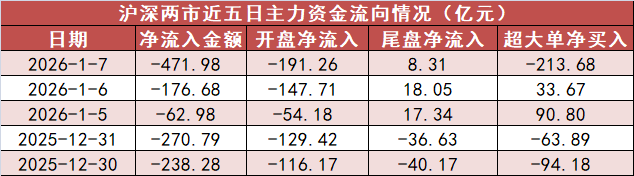 1月7日,A股市场主要指数整体上涨。 截至收盘,上证指数收报4085.77点,上涨0.05%,深证成指收报14030.56点,上涨0.06%,创业板指收报3329.69点,上涨0.31%,北证50指数上涨0.22%,A股市场合计成交约2.88万亿元,已连续两个交易日超过2.8万亿元。 1.A股市场全天主力资金净流出471.98亿元 今日A股市场主力资金开盘净流出191.26亿元,尾盘净流入8.31亿元,A股市场全天主力资金净流出471.98亿元。
