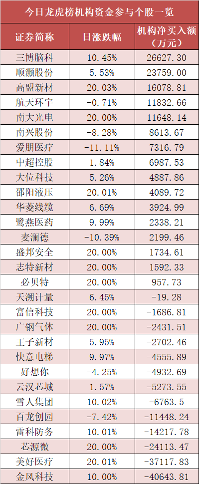 (注:此表为主力资金净流入统计,与上一张表及下一张表的机构净买入统计口径均不同) 5. 龙虎榜机构抢筹多股 盘后龙虎榜数据显示,机构现身多股,其中三博脑科等股票呈现机构资金净买入,金风科技等股票呈现机构资金净卖出。