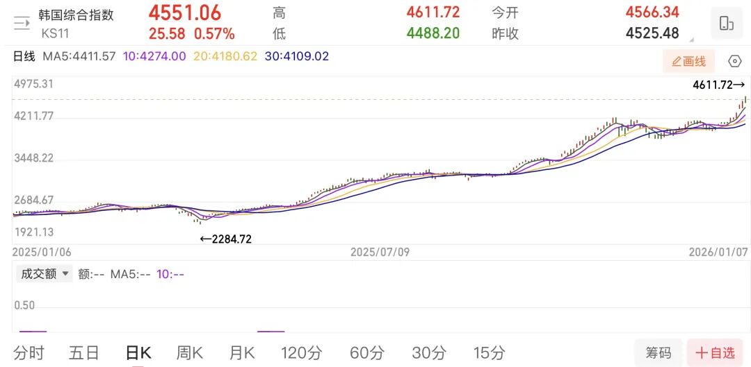 2026年开年,韩国股市延续去年强劲涨势,继续高歌猛进。 1月6日,韩国综合股价指数(KOSPI)首次突破4500点大关;1月7日,韩国股市继续上涨,截至收盘,KOSPI指数涨0.57%,报4551.06点。