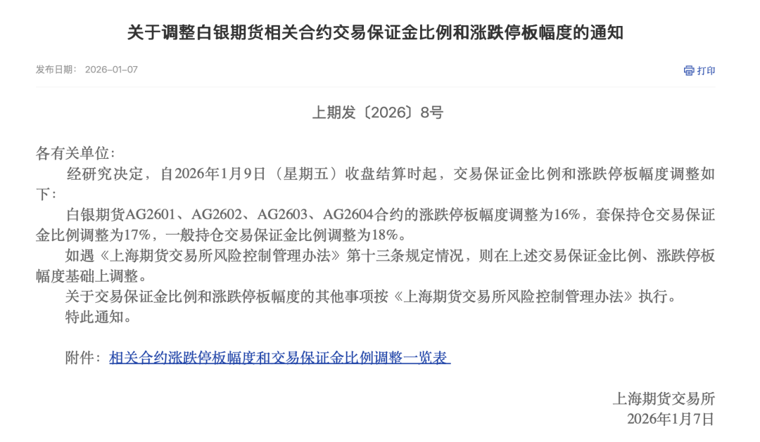 上期所还调整了白银期货相关合约交易保证金比例和涨跌停板幅度。根据通知,自2026年1月9日(星期五)收盘结算时起,交易保证金比例和涨跌停板幅度调整如下:白银期货AG2601、AG2602、AG2603、AG2604合约的涨跌停板幅度调整为16%,套保持仓交易保证金比例调整为17%,一般持仓交易保证金比例调整为18%。