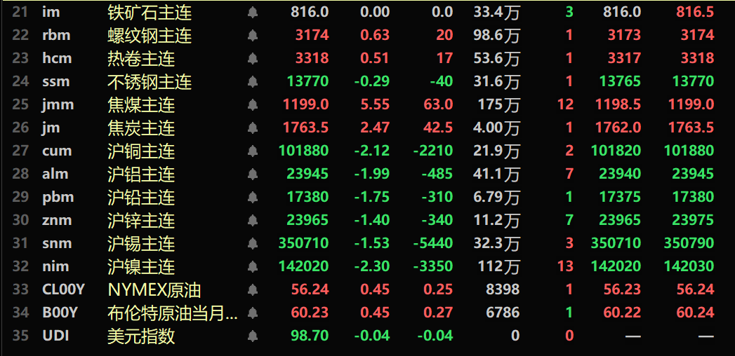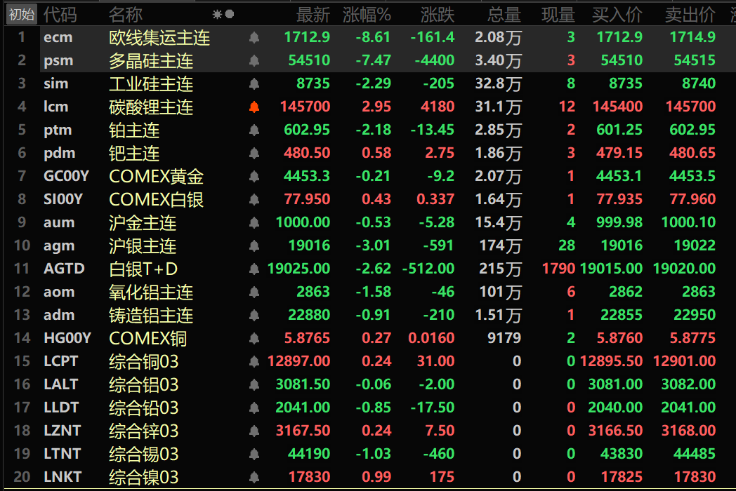 SMM1月8日讯: 金属市场方面: 截至午间收盘,内盘基本金属全线下跌,沪铜跌2.12%。沪铝跌1.99%。沪铅跌1.75%,沪锌跌1.4%。沪锡跌1.53%,沪镍跌2.3%。 此外,铸造铝主连期货跌0.91%,氧化铝主连跌1.58%。碳酸锂主连涨2.95%。工业硅主连跌2.29%。多晶硅主连跌7.47%。 黑色系多飘红,铁矿平于816元/吨,螺纹涨0.63%,热卷涨0.51%,不锈钢跌0.29%。双焦方面:焦煤主力合约涨5.55%,焦炭主力合约涨2.47%。 外盘基本金属方面,截至11:38分,LME金属涨跌互现。伦铜涨0.24%,伦铝跌0.06%。伦铅跌0.85%。伦锌涨0.24%。伦锡跌1.03%。伦镍涨0.99%。 贵金属方面,截至11:38分,COMEX黄金跌0.21%;COMEX白银涨0.43%。内盘贵金属方面:沪金主连跌0.53%,沪银主连跌3.01%。 此外,截至午间收盘,铂主连期货跌2.18%,钯主连期货涨0.58%。 截至午间收盘,欧线集运主力合约跌8.61%,报1712.9点。 截至1月5日11:38分,部分期货午间行情:
