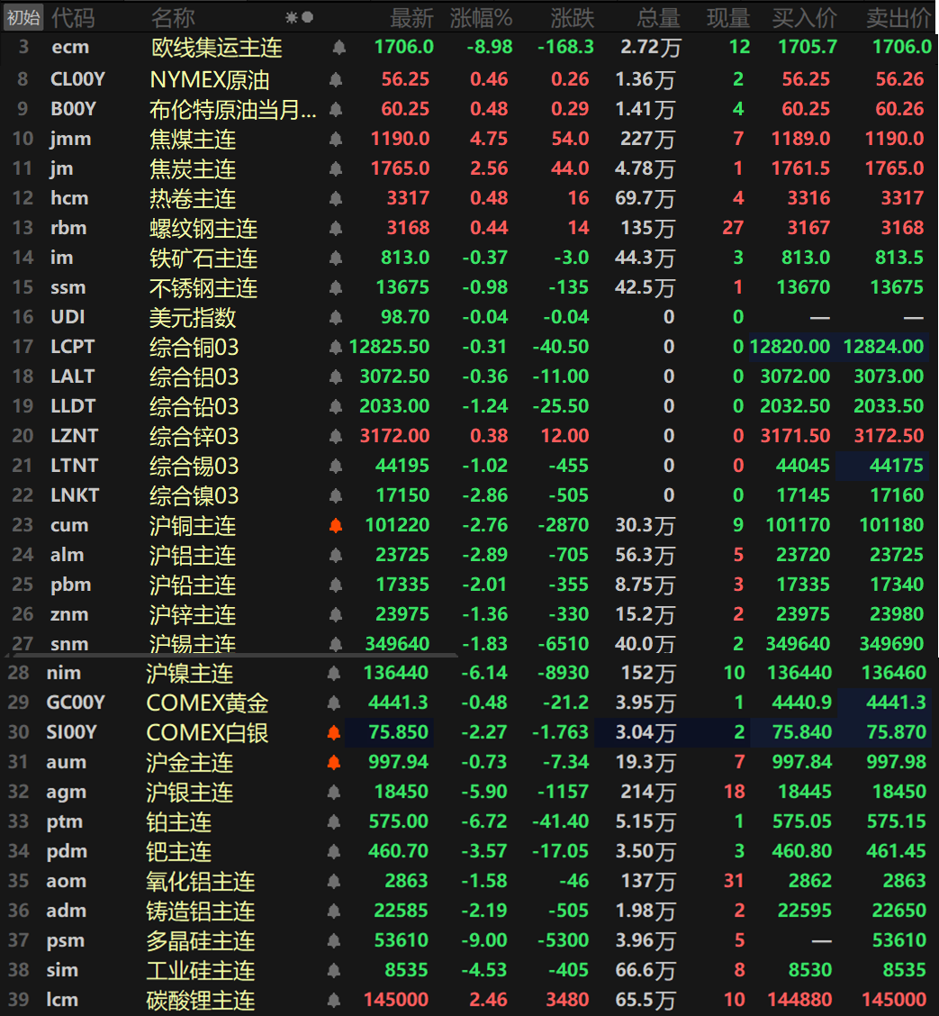 SMM 1月8日讯: 金属市场: 截至日间收盘,内盘基本金属集体下挫,且跌幅均在1%以上。沪镍以高达6.14%的跌幅领跌,沪铜、沪铝以及沪铅一同跌超2%,沪铜跌2.76%,沪铝跌2.89%,沪铅跌2.01%。沪锌跌1.36%,沪锡跌1.83%。氧化铝主连跌1.58%,铸造铝主连跌2.19%。 此外,碳酸锂主连涨2.46%,工业硅主连跌4.53%,多晶硅主连以9%的跌幅跌停,报53610元/吨。欧线集运主连跌8.98报1706。 黑色系方面涨跌互现,不锈钢跌0.98%,铁矿跌0.37%,其余品种均上涨,螺纹、热卷涨幅均在1%以内。双焦一同涨逾2%,焦炭涨2.56%,焦煤涨4.75%。 截至15:02分,外盘基本金属普跌,仅伦锌小幅上涨0.38%。伦镍跌2.86%,伦铅、伦锡跌1%,伦铅跌1.24%,伦锡跌1.02%,其余金属跌幅均在1%以内。 贵金属方面,截至15:02分,COMEX黄金跌0.48%,COMEX白银跌2.27%。国内方面,沪金跌0.73%,沪银跌5.9%。 此外,铂主连跌6.72%,钯主连跌3.57%。 截至今日15:02分行情