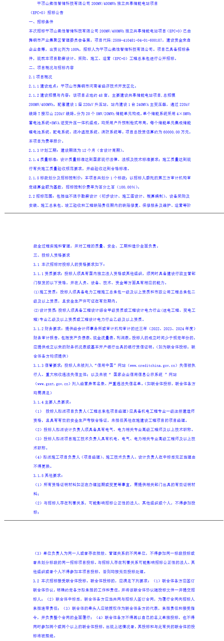 1月8日,平顶山桑佳智储科技有限公司启动200MW/400MWh独立共享储能电站项目EPC+O公开招标,项目总投资约6亿元,建设资金为企业自筹,约合1.5元/Wh。