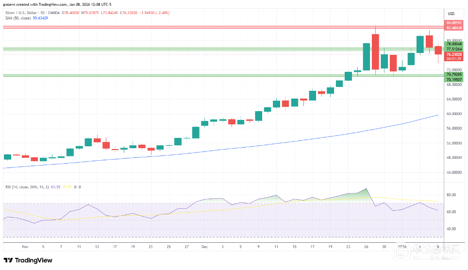 由于交易员逢低买入,铂金从日低反弹。从技术面来看,铂金需要回落至2265美元上方,才有机会在短期内获得可持续的上行动能。 如果铂金回升至2300美元上方,则将向2450美元附近的近期高点移动。 美国时间1月8日,全球最大白银ETF——iShares Silver Trust的白银持仓量为16215.43吨,较前一交易日增加115.6吨。 白银网 |