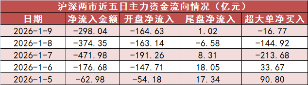 1月9日,A股市场整体上涨。 截至收盘,上证指数收报4120.43点,上涨0.92%,深证成指收报14120.15点,上涨1.15%,创业板指收报3327.81点,上涨0.77%,北证50指数上涨1.05%。 1.A股市场全天资金净流出298.04亿元 今日A股市场主力资金开盘净流出164.63亿元,尾盘净流入1.02亿元,A股市场全天主力资金净流出298.04亿元。