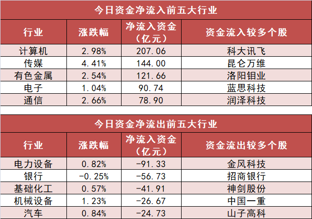 3. 计算机行业净流入207.06亿元居首 申万一级行业中,13个行业实现资金净流入,其中计算机行业净流入207.06亿元居首。