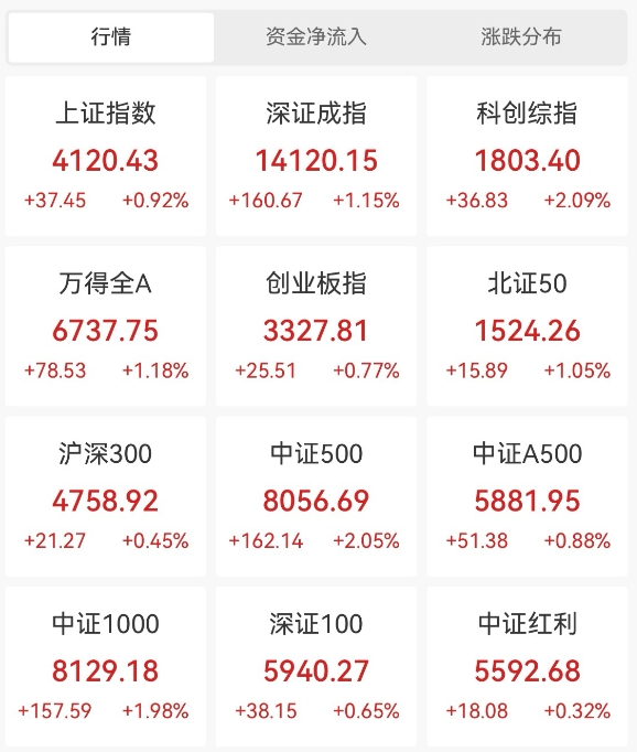 本周主力资金净流出光模块和商业航天概念股。 今日(1月9日),A股全天震荡走强。截至收盘,上证指数涨0.92%,日K线16连阳,站上4100点关口,最新报4120.43点。深证成指涨1.15%,创业板指涨0.77%。市场全天成交31523.68亿元,较昨日大幅放量3260.66亿元。