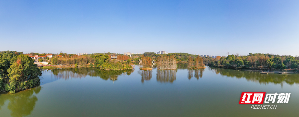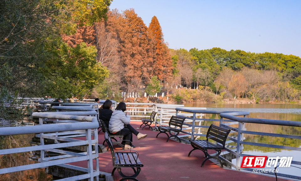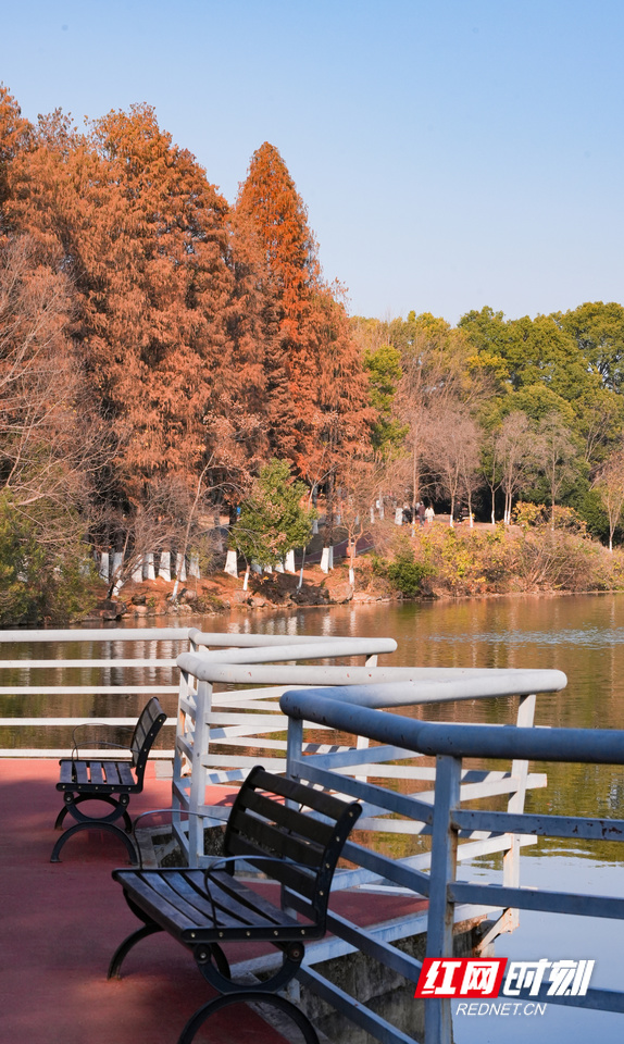 澄澈如洗的天空下,湖水似一块温润的翡翠。 红网时刻新闻1月9日讯(记者 王新凤 李璐)1月9日,衡阳迎来又一个阳光和煦的冬日,舒适的气候让南湖景区成为市民休闲打卡的热门选择。其中,园内大片正值观赏期的水杉林,成为最引人驻足的风景。