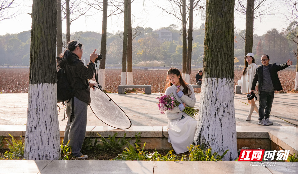 年轻人在南湖公园内拍摄写真。 记者在现场看到,水杉林绚烂如画。赭红、金棕与深绿交织的叶片在蓝天下层次分明,笔直挺拔的树干间光影斑驳。不少市民专程漫步杉林小径,或仰首观赏,或举起手机拍摄。