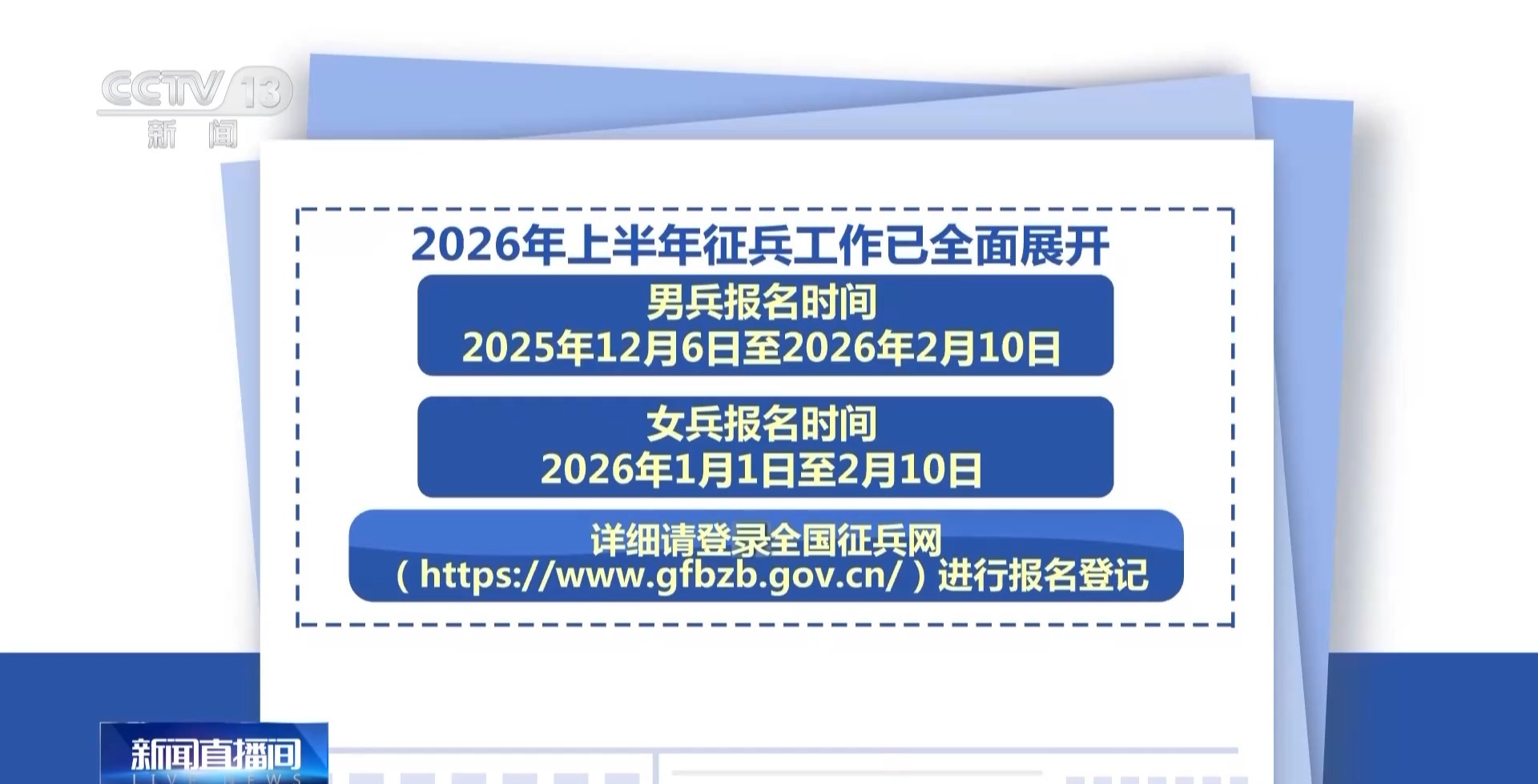 据了解,2026年上半年征兵工作已全面展开,上半年男兵报名时间为2025年12月6日至2026年2月10日,女兵报名时间为2026年1月1日至2月10日,详细请登录全国征兵网(https://www.gfbzb.gov.cn/)进行报名登记。 责编:刘畅畅 一审:刘畅畅 二审:印奕帆 三审:谭登 来源:央视新闻客户端 |