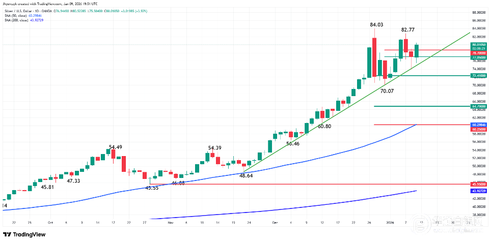 【华通白银网1月12日】•银价在突破80美元后飙升3.56%,多头瞄准阻力位82.77美元和历史高点84.03美元。 •77.05-78.70美元的关键支撑区域控制着近期走势,持续突破该区域表明未来买盘势头强劲。 •自去年11月48.64美元低点形成的上升趋势线当前位于74.83美元,已成为多头关键的中期支撑防线。 白银飙升超3%,多头瞄准历史新高 现货白银周五尾盘走高。早前,银价曾突破80美元,但目前低于该水平。多头在82.77美元的波动顶部和84.03美元的主要顶部仍面临阻力。 关键支撑区控制近期方向