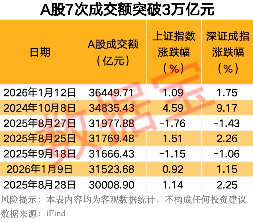同花顺iFind数据显示,1月12日收盘,沪深北三市成交额为36449.71亿元,较上个交易日放量4926.03亿元,突破2024年10月8日的34835.43亿元,创历史新高。历史数据显示,A股成交额共有7次突破3万亿元。