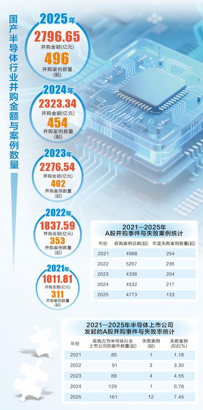 证券时报记者 阮润生 2025年A股半导体上市公司并购重组浪潮迭起,并购案例数量同比提升超15%,重组目的更加聚焦资产整合、战略合作;与此同时,半导体并购行业失败率也有所抬升。 多位业内人士向证券时报记者表示,尽管监管审核包容性提升,但当前半导体行业一二级市场估值分歧凸显,成为并购失败的重要原因。当前,买卖双方围绕估值对价、业绩承诺等核心条款达成共识的难度增加。有业内人士建议,并购双方采取差异化并购、并购基金分段孵化等方式,降低半导体并购重组失败风险。 并购失败案例增加 “成功并购本来就是个小概率事件。”一位长期负责并购业务的电子行业上市公司高管向记者强调,经历2014年、2015年高估值高溢价、盲目跨界、业绩对赌虚高等并购乱象后,如今收并购双方都格外谨慎,何况半导体收购本身就是充满风险。 自2024年9月“并购六条”出台以来,以半导体为代表的“硬科技”企业并购重组高潮迭起。据不完全统计,2025年上市公司资产整合、战略合作目的收购增多,整体重组失败率同比下降,并购市场趋于理性,但是半导体行业内并购失败率随着案例增多而抬升。既有千亿级市值的海光信息与中科曙光的换股吸收合并案终止,也涉及思瑞浦、芯原股份、帝奥微等细分赛道龙头的收购尝试折戟。 据不完全统计,2025年A股并购市场案例数量约4773起,总量同比提升约5%,整体重组失败案例数量同比下降约两个百分点;涉及半导体行业间的并购案例活跃度进一步提升,年内案例增至161起,同比提升近25%,失败案例达12起,数量均创近五年新高。相比之下,非半导体企业发起的“跨界”半导体收购活动数量同比减少。 放眼整个行业,国内半导体并购活动也出现了类似情况。投中嘉川CVSource数据显示,2025年中国半导体并购金额合计达到2796.65亿元,并购案例高达496起,失败案例32起,数量同比增长超2倍,均创历史新高。 有观点认为,2025年下半年半导体行业二级市场大幅波动,增加了收购难度。以Wind半导体精选指数为例,2025年板块累计上涨约51%。在海光信息吸收合并中科曙光案例中,中科曙光原本就持有海光信息28%股份,嵌套持股叠加市场波动增大估值难度。终止说明会上,两家公司高管归因都提到二级市场股价的影响。 对于二级市场对收购因素影响,IO资本创始合伙人赵占祥向记者表示,二级市场波动通常对并购影响相对有限,上市公司股价上涨有可能会导致卖方预期提升,但并购案例差异化很高,需要一事一议。 另一方面,去年下半年未盈利半导体企业上市通道重启,为并购市场卖方增多选项,也为并购交易增加了不确定性。半导体行业并购终止案例中,不少标的有过上市计划,甚至自身就在IPO审核进程中。 德恒上海律师事务所高级合伙人、并购部负责人杨敏向记者表示:“2025年港股是非常火热的,上交所科创板第五套标准以及创业板的第三套标准分别在去年6月重启与强化推广,鼓励未盈利的企业上市,IPO预期升温背景下,卖方标的寻求并购的意愿就不再强烈,不排除质地达标的半导体企业会选择独立上市。” 估值博弈加剧 透过上市公司对外披露的重组终止原因来看,除了市场环境等客观因素外,基本绕不开“核心条款未达成一致”,折射出当前半导体行业一二级市场估值博弈难度提升。 “2024年‘并购六条’出台后,国内半导体行业并购加速;但2025年行业估值分歧日益凸显,特别是卖方一级市场估值当时处于历史高位;相比之下,买方基于行业调整期的真实业绩进行定价,买卖双方价格形成巨大落差,导致交易难以达成。”杨敏指出。 记者注意到,当前半导体行业终止案例中,绝大多数被收购标的外部投资人集中在2021年前后入股。彼时在“缺芯涨价”与国产化替代主题催化,半导体行业标的以冲击上市为目标下估值飙升。投中嘉川CVSource数据显示,2021年半导体行业整体平均市盈率估值高达291倍,伴随着半导体行业景气度回落,半导体估值回调,2024年行业平均估值降到53倍。 进一步来看,不同行业周期下入股成本差异,为日后投资人通过统一定价的并购退出“埋雷”。在*ST双成收购奥拉股份中,即便交易双方隶属同一实际控制人,但在终止原因中,上市公司直陈难以调和不同轮投资方利益,导致交易各方对交易对价等商业条款未能达成一致意见而告终。2025年11月思瑞浦也计划收购奥拉股份,以期实现模拟芯片领域的“强强联合”,但这笔收购宣布后迅速叫停,称“实施重大资产重组的条件尚未完全成熟”。 “半导体是周期性很强的行业,2021至2022年经历了半导体行业上行周期,随后回落,当前并购双方都有意愿趁行业回暖期实现整合。”赵占祥向记者表示。另一方面,市场格局、行业属性差异等因素会增加双方博弈难度。从已披露的案例来看,当前A股半导体收购标的集中在成熟制程,如果标的所在行业竞争加剧,在推进和完成的并购交易中,一二市场标的估值“倒挂”现象就会经常出现。 比如,2025年12月,A股半导体IP头部厂商芯原股份虽然宣布终止收购芯来科技,但对逐点半导体的收购正在推进,标的全部股份对应的股权价值为9.5亿元;对比标的公司曾于2023年筹划登陆A股,其最后一轮的投后估值高达36亿元,本次收购估值大幅打折。 “即便同处于一行业,上下游的纵向并购难度通常比横向并购难度更大。”杨敏提示。 作为数字芯片设计厂商,国科微2025年6月