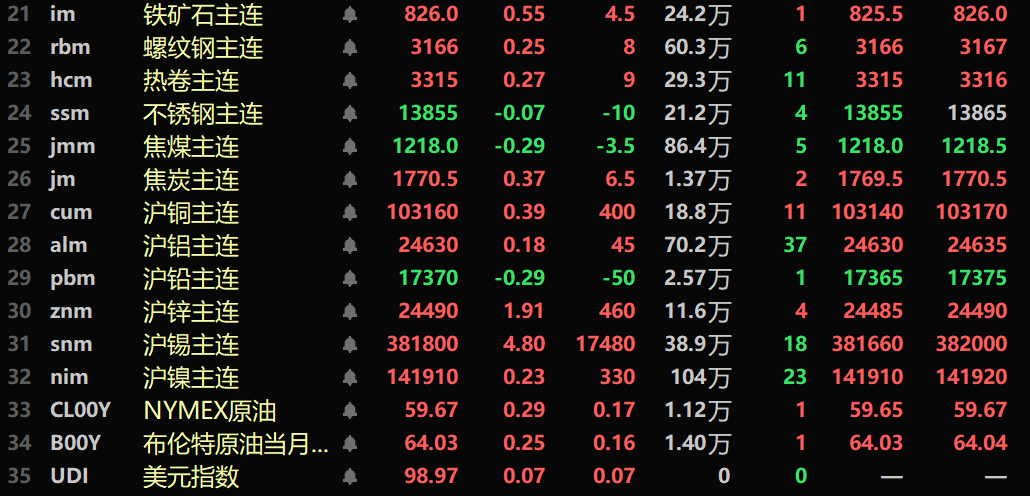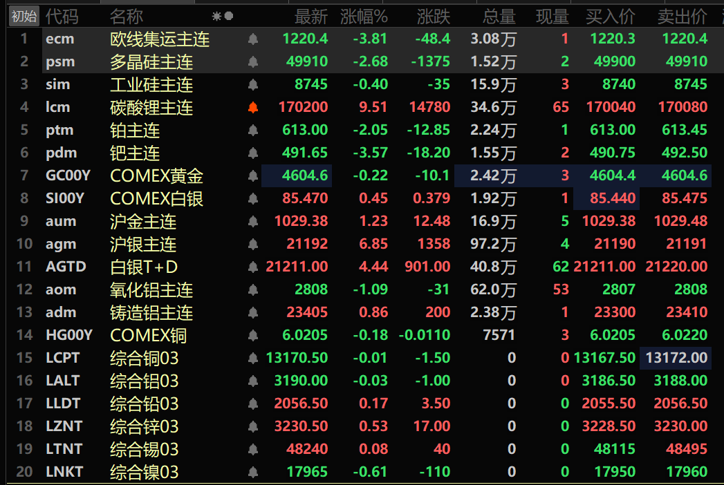 SMM1月13日讯: 金属市场方面: 截至午间收盘,内盘基本金属普涨,沪铜涨0.39%。沪铝涨0.18%。沪铅跌0.29%,沪锌涨1.91%。沪锡涨4.8%,沪镍涨0.23%。 此外,铸造铝主连期货跌1.09%,氧化铝主连涨0.86%。碳酸锂主连涨9.51%,盘中刷新2023年10月以来的新高至174060元/吨。工业硅主连跌0.4%。多晶硅主连跌2.68%。 黑色系多飘红,铁矿涨0.55%,螺纹涨0.25%,热卷涨0.27%,不锈钢跌0.07%。双焦方面:焦煤主力合约跌0.29%,焦炭主力合约涨0.37%。 外盘基本金属方面,截至11:41分,LME金属涨跌互现。伦铜、伦铝微跌。伦铅涨0.17%。伦锌涨0.53%。伦锡微涨0.08%。伦镍跌0.61%。 贵金属方面,截至11:41分,COMEX黄金跌0.22%;COMEX白银涨0.45%。内盘贵金属方面:沪金主连涨1.23%;沪银主连涨6.85%,盘中刷新历史新高至21518元/千克。花旗表示,其基准情景下0至3个月的目标价格现为黄金每盎司5000美元,白银每盎司100美元。 此外,截至午间收盘,铂主连期货跌2.05%,钯主连期货跌3.57%。 截至午间收盘,欧线集运主力合约跌3.81%,报1220.4点。 截至1月13日11:41分,部分期货午间行情:
