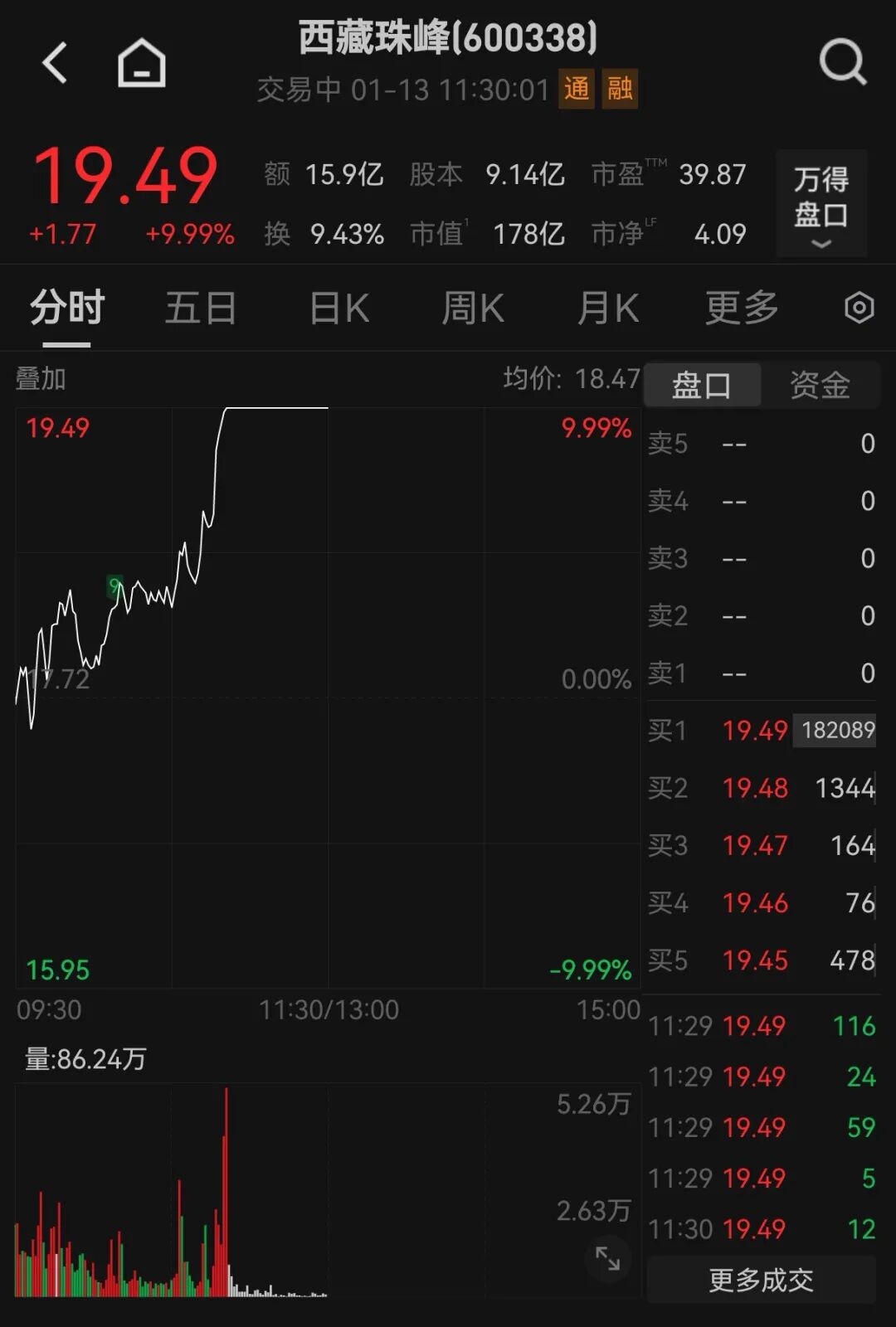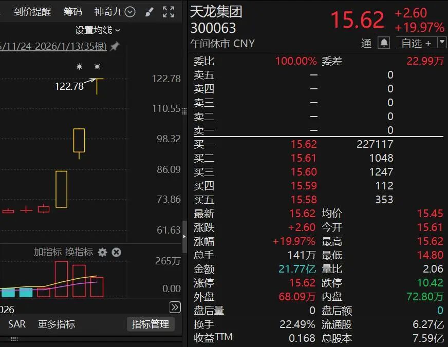 人工智能概念股早盘集体爆发,其中天龙集团(300063)连续3日20%涨停。 1月13日早盘,A股微幅震荡,上证指数红绿之间转换超10次,深证成指也在创4年新高后震荡调整,大盘蓝筹股表现较优,上证50、沪深300均微幅飘红,并创多年新高。成交有进一步放大趋势,深市1小时成交再破万亿元并创历史新高。