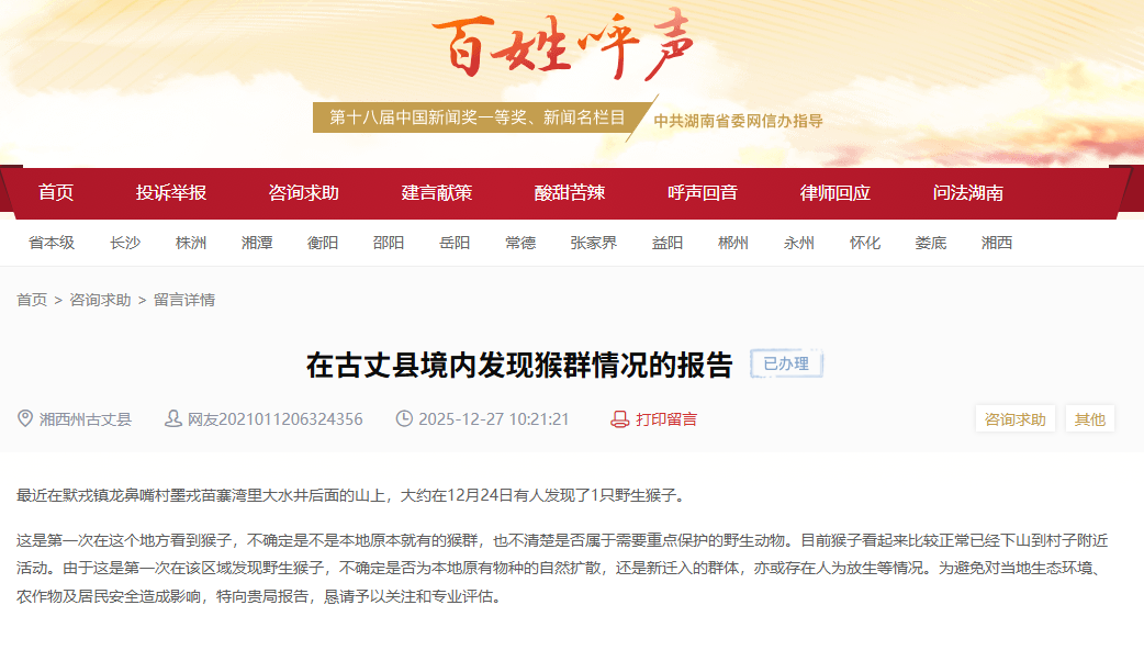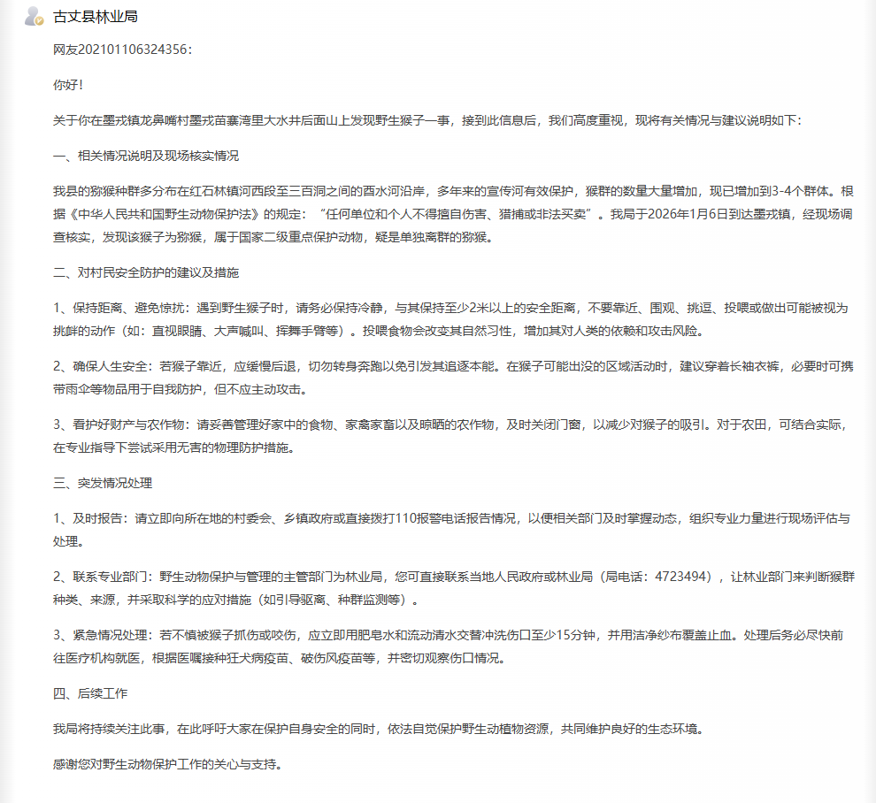 网友在《百姓呼声》栏目上的发帖内容与官方回应。 红网时刻新闻1月13日讯(记者 陈星晓)近日,有网友在红网《百姓呼声》栏目反映,在湘西州古丈县默戎镇龙鼻嘴村附近山上发现野生猴子活动。这是该区域首次观测到野生猴群,引发公众对其来源、保护等级及潜在影响的关注。古丈县林业局对此进行详细回应。 据网友描述,2025年12月24日在墨戎苗寨湾里大水井后方山上发现一只野生猴子,猴子已下山活动。由于是首次发现,网友不确定其是否为本地物种自然扩散,还是新迁入群体或人为放生所致,担心可能对当地生态、农作物及居民安全造成影响,故请求相关部门进行专业评估。