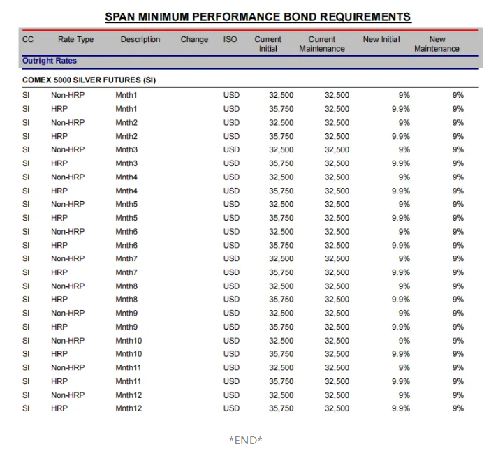 根据文件具体内容,部分非高风险组合(Non-HRP)黄金合约的保证金比例(Outright Rates)将调整为名义价值的约5%,白银约为9%。