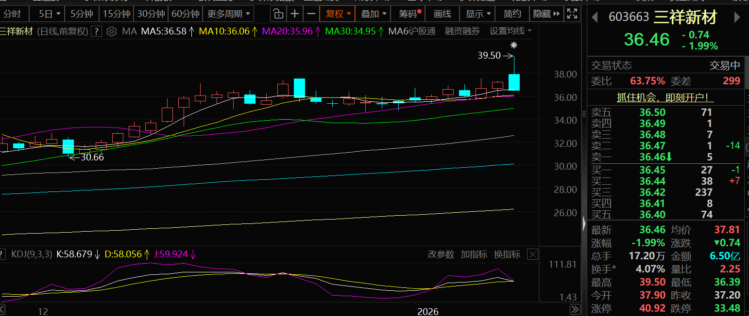 1月13日,三祥新材股价出现下跌,截至13日13:37分,三祥新材跌1.99%,报36.46元/股。