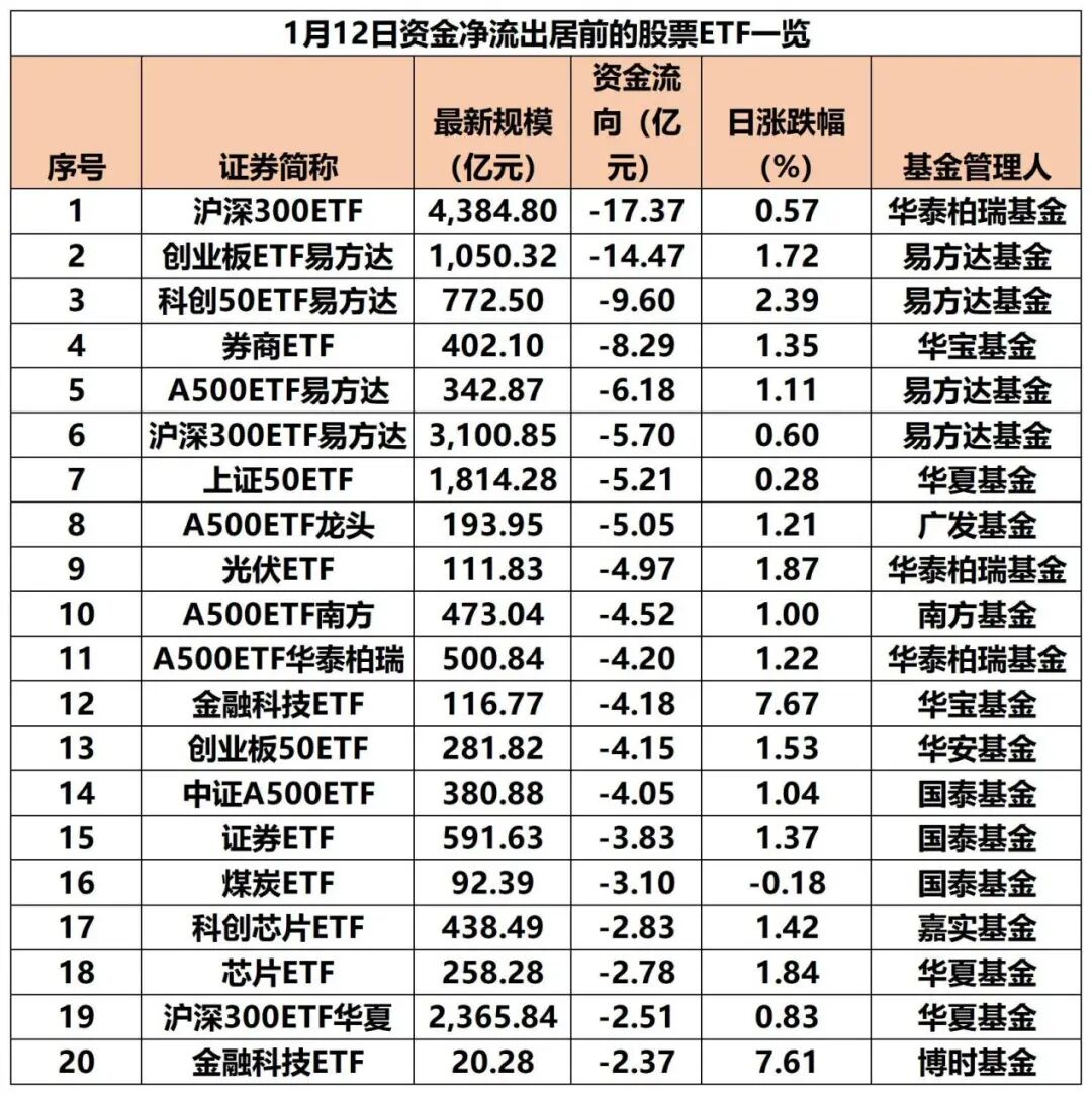 1月12日,A股三大指数继续强势表现,沪指日线17连阳再创逾十年新高。股票ETF资金净流入超130亿元。其中,传媒、卫星、软件、有色金属等热门主题ETF资金净流入居前,沪深300ETF、创业板ETF、科创50ETF、A500ETF等宽基ETF成为“失血”大户。 昨日股票ETF资金净流入超130亿元 昨日(1月12日),市场震荡拉升,三大指数均涨超1%,全市场股票ETF(含跨境ETF)资金净流入131.3亿元。 净流入前5板块分别为传媒(净流入38.0亿元)、有色金属(净流入32.2亿元)、卫星产业(净流入27.7亿元)、人工智能(净流入26.1亿元)、国防军工(净流入23.9亿元)。 净流出前5板块分别为中证A500指数(净流出28.7亿元)、沪深300指数(净流出27.7亿元)、创业板(净流出21.5亿元)、科创板50指数(净流出16.5亿元)、证券(净流出13.3亿元)。 头部基金公司方面,易方达基金ETF最新规模达8866.2亿元,昨日规模增加86.4亿元;2026年以来,规模增加449.2亿元。 易方达旗下人工智能ETF净流入3.3亿元,港股通互联网ETF净流入2.8亿元,证券保险ETF净流入2.7亿元,云计算ETF净流入2.0亿元,半导体设备ETF净流入1.4亿元。 华夏基金ETF方面,1月12日,航空航天ETF和游戏ETF单日净流入居前,分别净流入10.34亿元和6.78亿元,最新规模分别达37.81亿元和163.84亿元,对应跟踪指数近一月日均成交额分别为4.94亿元和8.36亿元。传媒ETF净流入5.76亿元,有色金属ETF和创业板软件ETF分别净流入4.02亿元和3.92亿元。 广发基金方面,旗下21只ETF也获资金净买入,全口径ETF规模再创新高,超3100亿元。其中,传媒ETF最受资金关注,昨日早盘即涨停,单日获资金净买入超23亿元,净买入额在全市场ETF中居首,最新规模达66.67亿元,是全市场同类规模最大的传媒主题指数基金;旗下稀有金属ETF此前连续11个交易日获资金加仓,昨日再获资金加仓超8.91亿元,净买入额在同类ETF中最多,最新规模超22亿元,规模流动性同类居前。此外,保险含量超68%的港股通非银ETF、工程机械ETF、半导体设备ETF、创新药ETF、中证1000ETF等热门品种,昨日获净流入均超1亿元。 传媒、卫星、软件、有色金属等热门主题ETF资金净流入居前 从单日资金净流入排行看,传媒ETF、卫星ETF、软件ETF、有色金属ETF等热门主题ETF资金净流入居前,中证1000ETF也成为“吸金”主力。