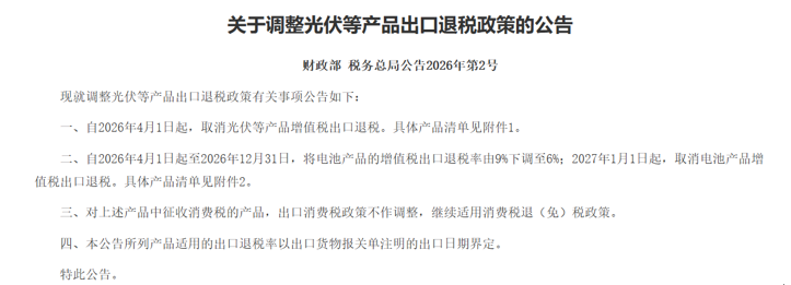 调整说明: 本次价格调整结合基于行业客观市场波动,为分布式光伏产品标准出厂指导价(含税不含运);具体详情可咨询销售经理;本价格随行业成本动态调整,最终解释权归天合光能所有; 1月9日晚间,财政部、税务总局发布关于调整光伏等产品出口退税政策的公告:自2026年4月1日起,取消光伏等产品增值税出口退税。自2026年4月1日起至2026年12月31日,将电池产品的增值税出口退税率由9%下调至6%;2027年1月1日起,取消电池产品增值税出口退税。对上述产品中征收消费税的产品,出口消费税政策不作调整,继续适用消费税退(免)税政策。本公告所列产品适用的出口退税率以出口货物报关单注明的出口日期界定。